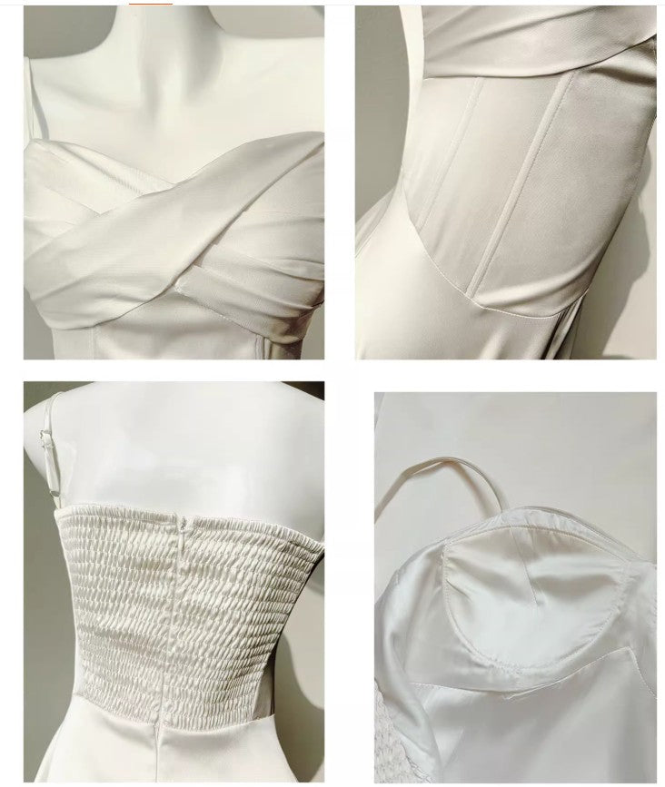 French Light Champagne Spaghetti Strap Satin A-Line Bridal Dress Elegant Wedding Guest Dress ED02244