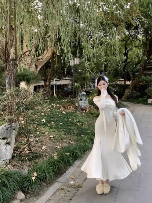 French style one-shoulder white long-sleeved knitted fishtail dress ED0428