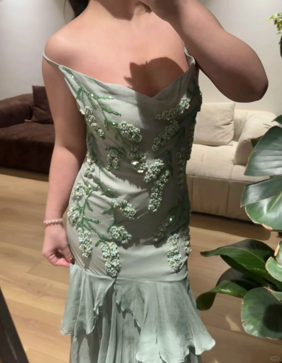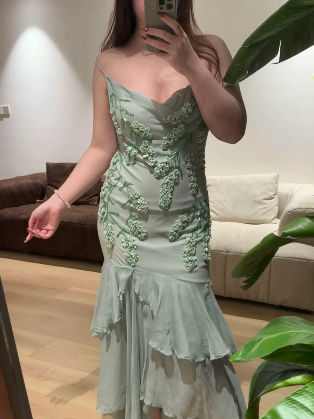 Fresh Green Beaded Sequined Chiffon Irregular Fishtail Prom Dress P3387