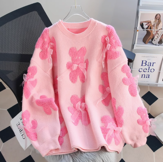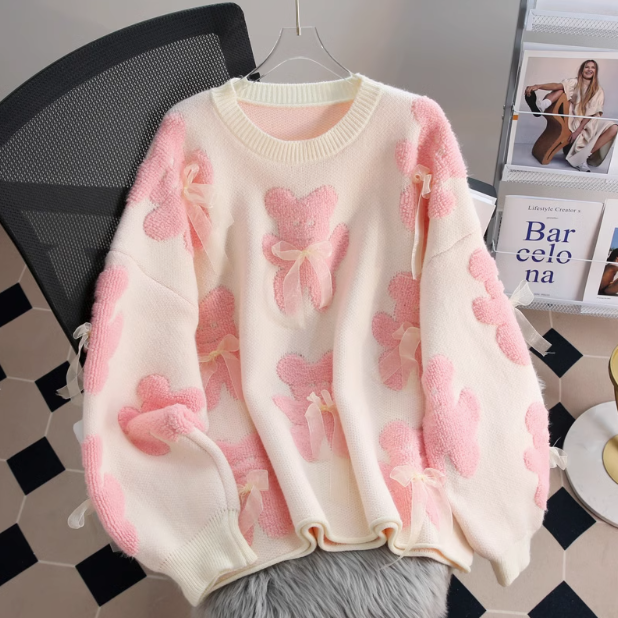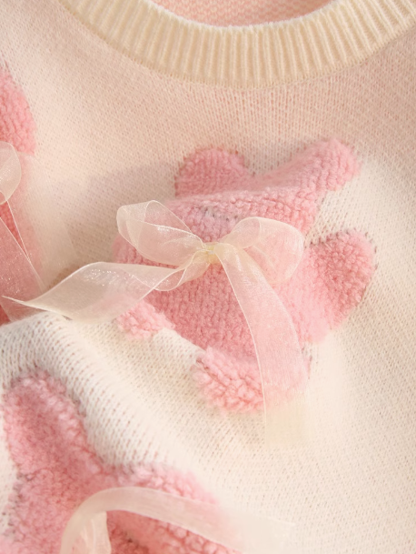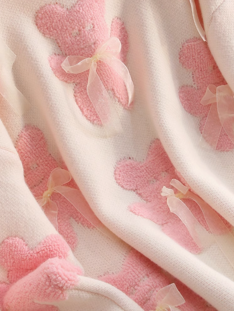 Gentle Pink Bear Bow Round Neck Sweater ED0386