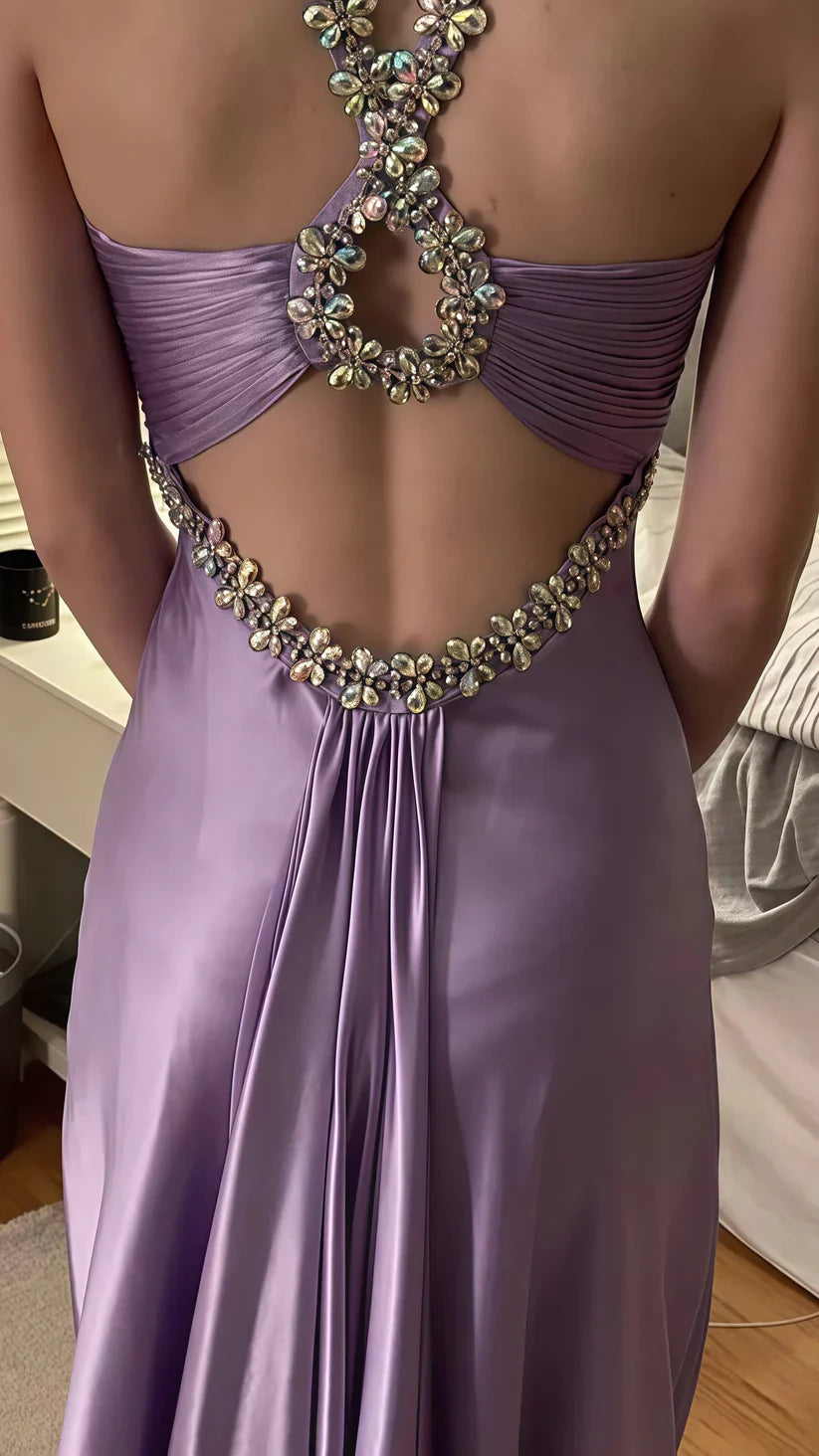Gentle Purple 💜Satin Beaded Backless Long Prom Dress for Pool Party&Birthday Sexy Evening Dresses