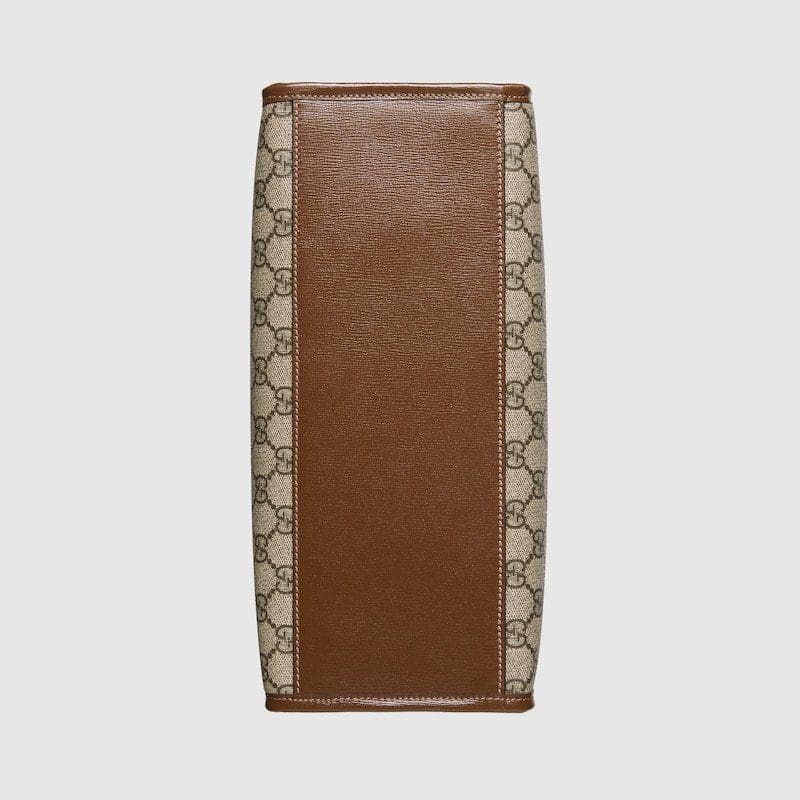 Designed in a structured shape, this small tote bag is crafted from GG Supreme canvas with brown leather trim, the small size double-handled silhouette has a top handle and shoulder strap.