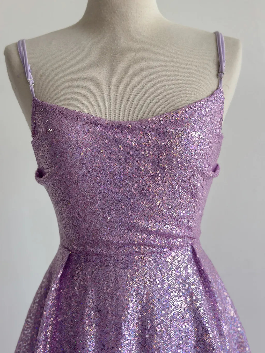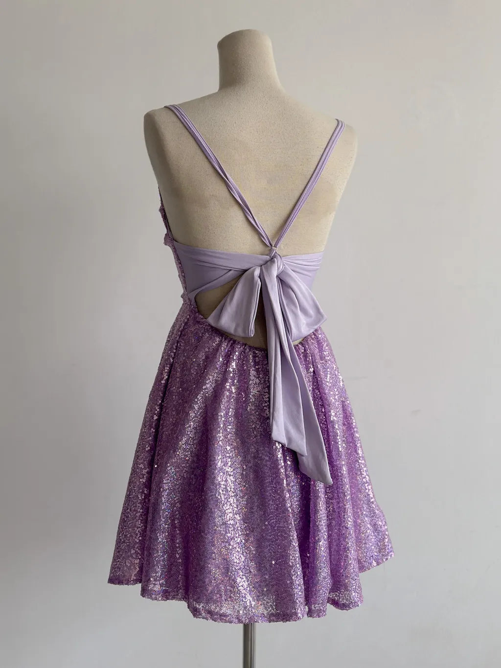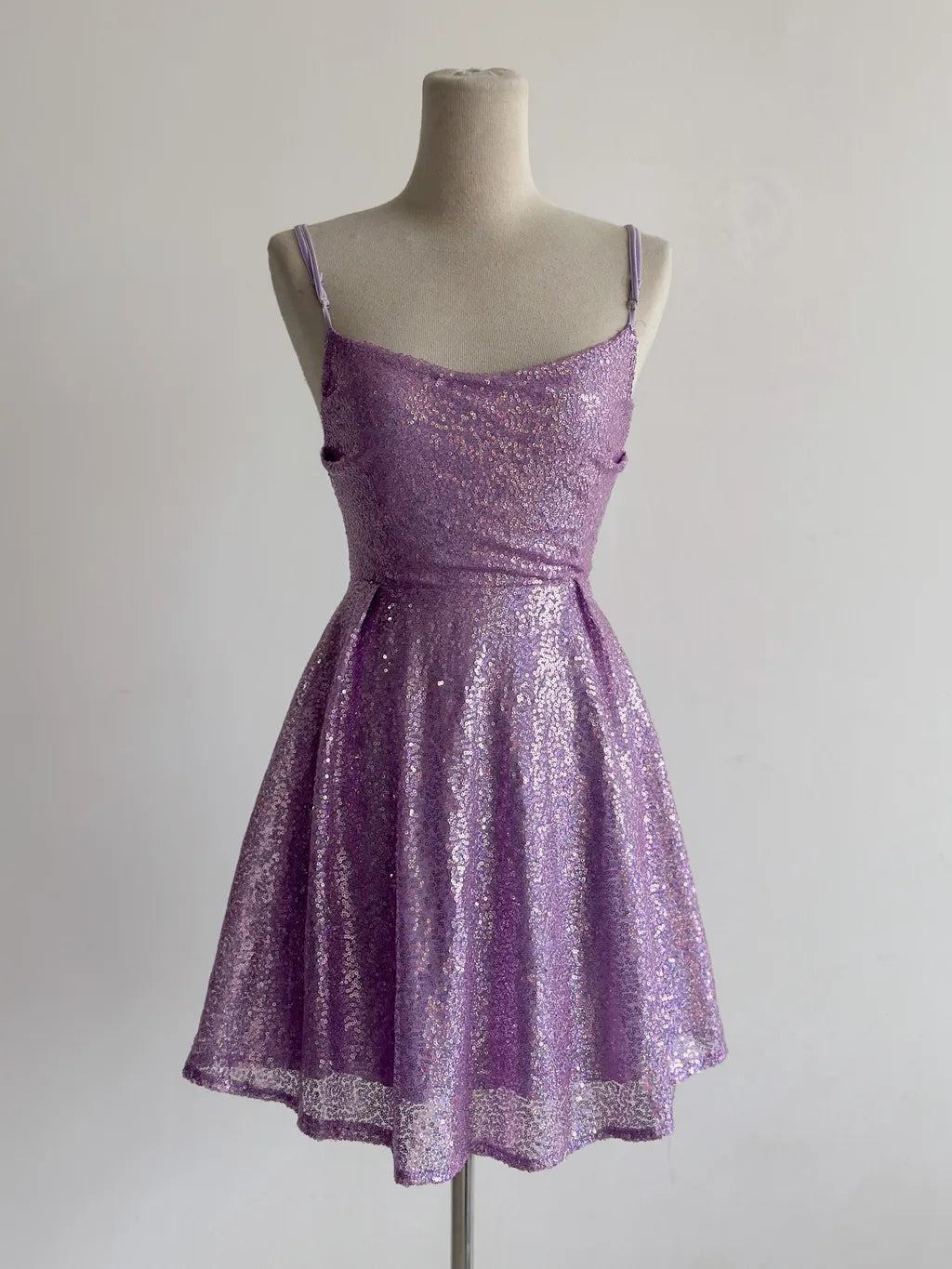Glitter Lilac Spaghetti Straps A-Line Tulle Sequin Short Vintage Prom Dresses ED03403