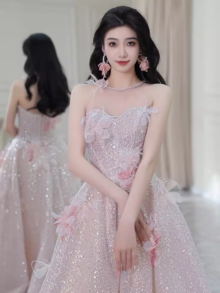 Gorgeous A line High Neckline Sequin Pink Prom Dress P1880