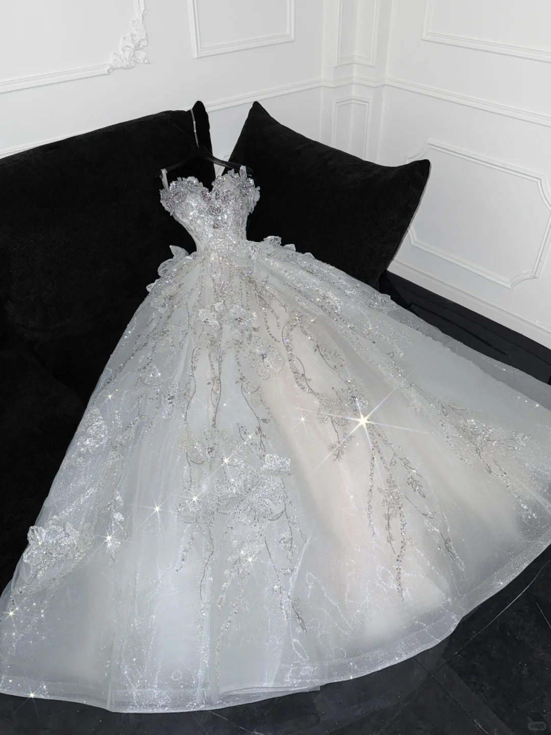 Gorgeous Ball Gown Strapless White Flower Silver Sequin Organza Prom Dress Party Dress SH3415