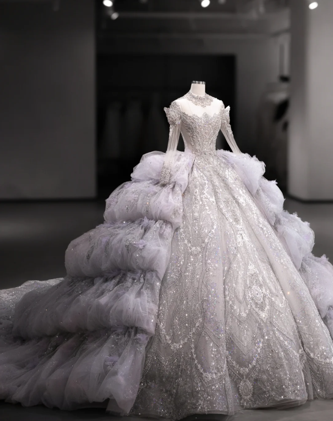 Gorgeous design purple crystal beaded princess fluffy floor-length wedding dress P2890