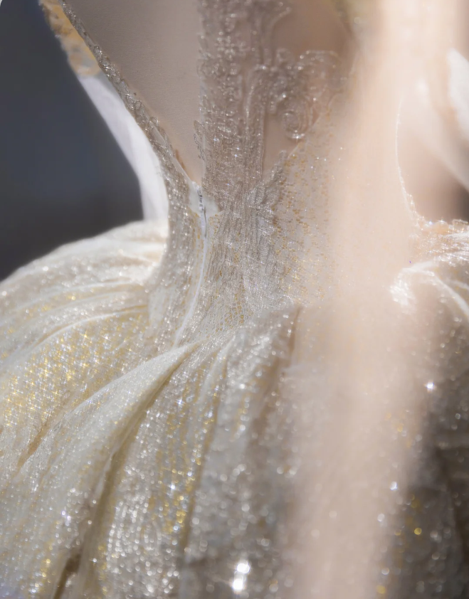 Gorgeous golden V-neck padded shoulder design long sleeve lace totem crystal sewn beads fluffy floor-length wedding dress P2892