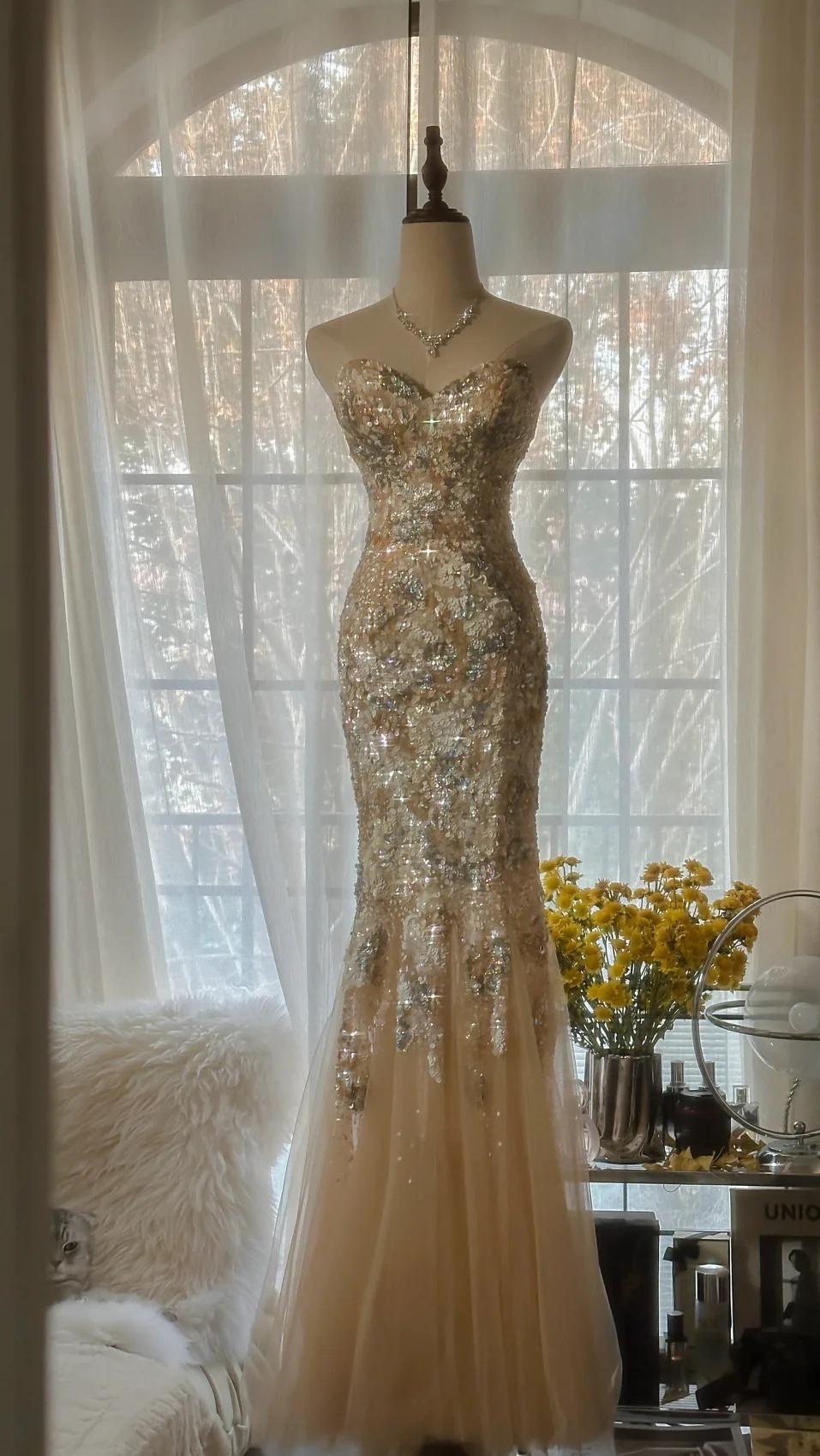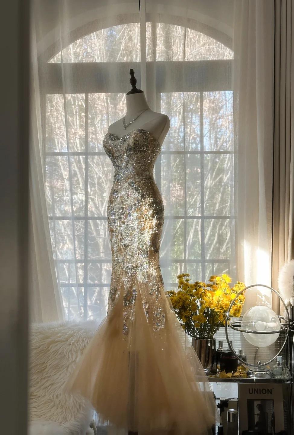 Gorgeous Light Champagne Sweetheart Neck Tulle Sequin Mermaid Long Prom Dresses Elegant Party Dress ED02286