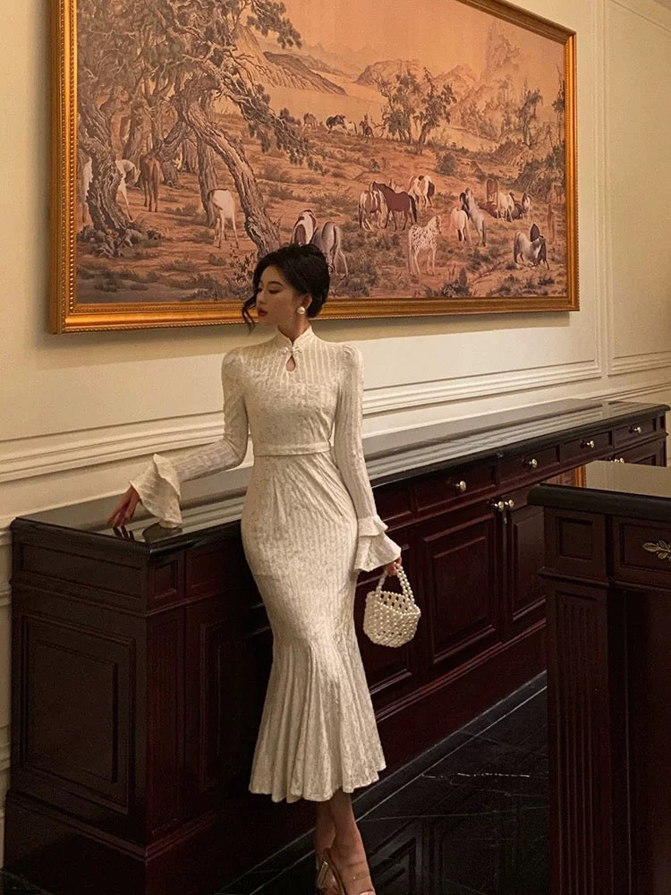 Gorgeous Mermaid High Neckline Ivory Satin Date Night Dress Prom Dresses Birthday Outfits SD1098