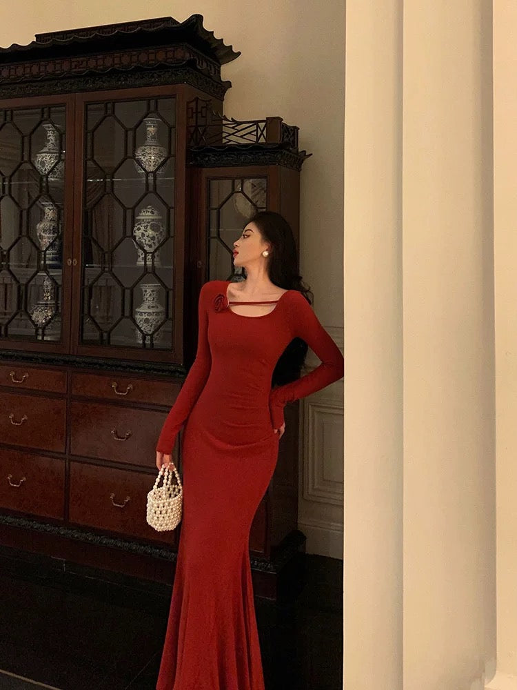 Gorgeous Mermaid Jewel Neckline Long Sleeves Date Night Dress Red Prom Dresses Birthday Outfits SD667