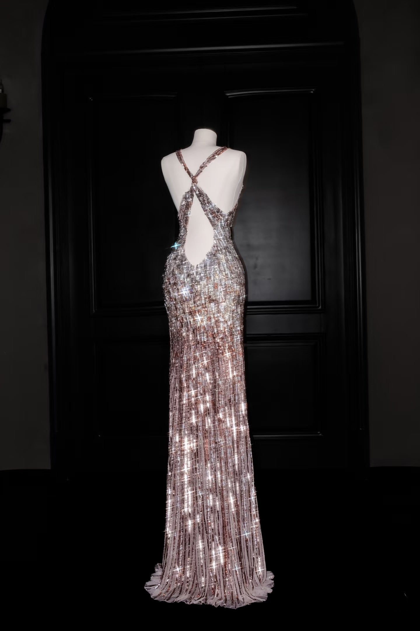 Gorgeous Mermaid V Neck Pink Sequin Long Prom Dress Party Dress Graduation Dresses D2736