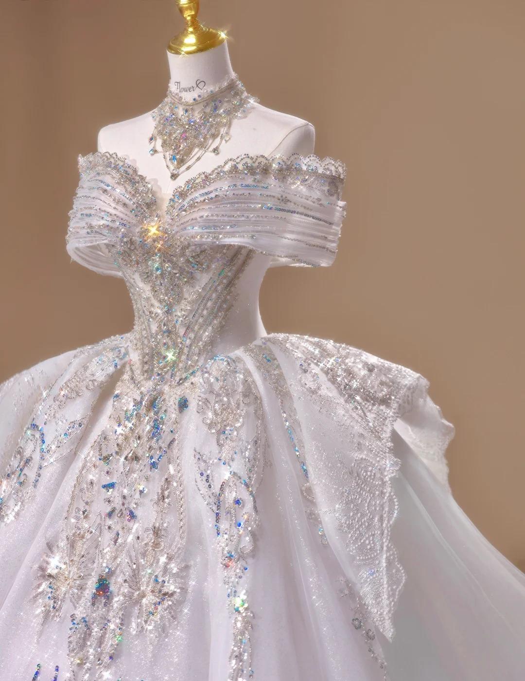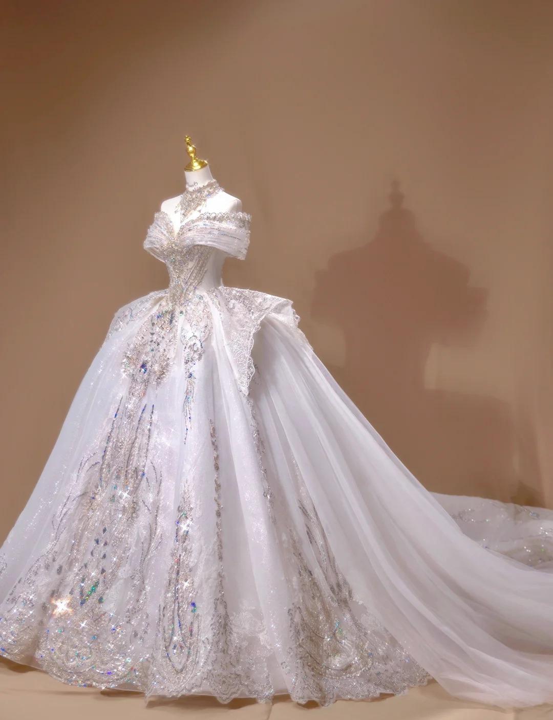 Gorgeous Off-the-shoulder A-Line Tulle Beaded Train Wedding Dress ED02434