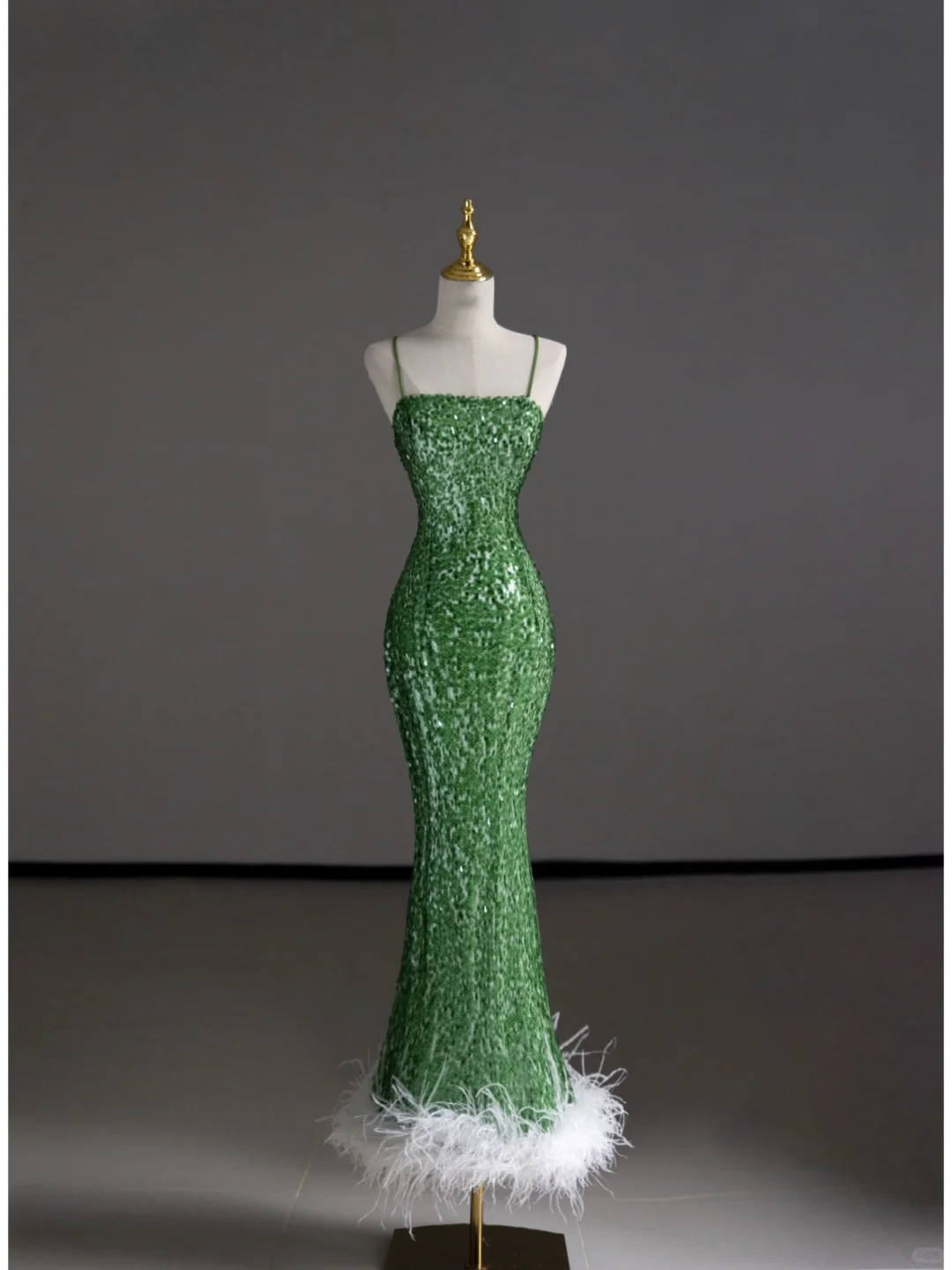 Gorgeous Sheath Spaghetti Straps Green Sleeveless Sequin Long Prom Dresses Graduation Dresses DP504