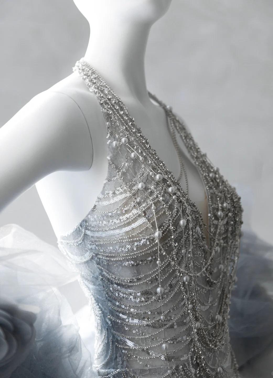 Gorgeous Silver V-neck Mermaid Beaded Sequin Long Prom Dresses Train Wedding Dress ED02524