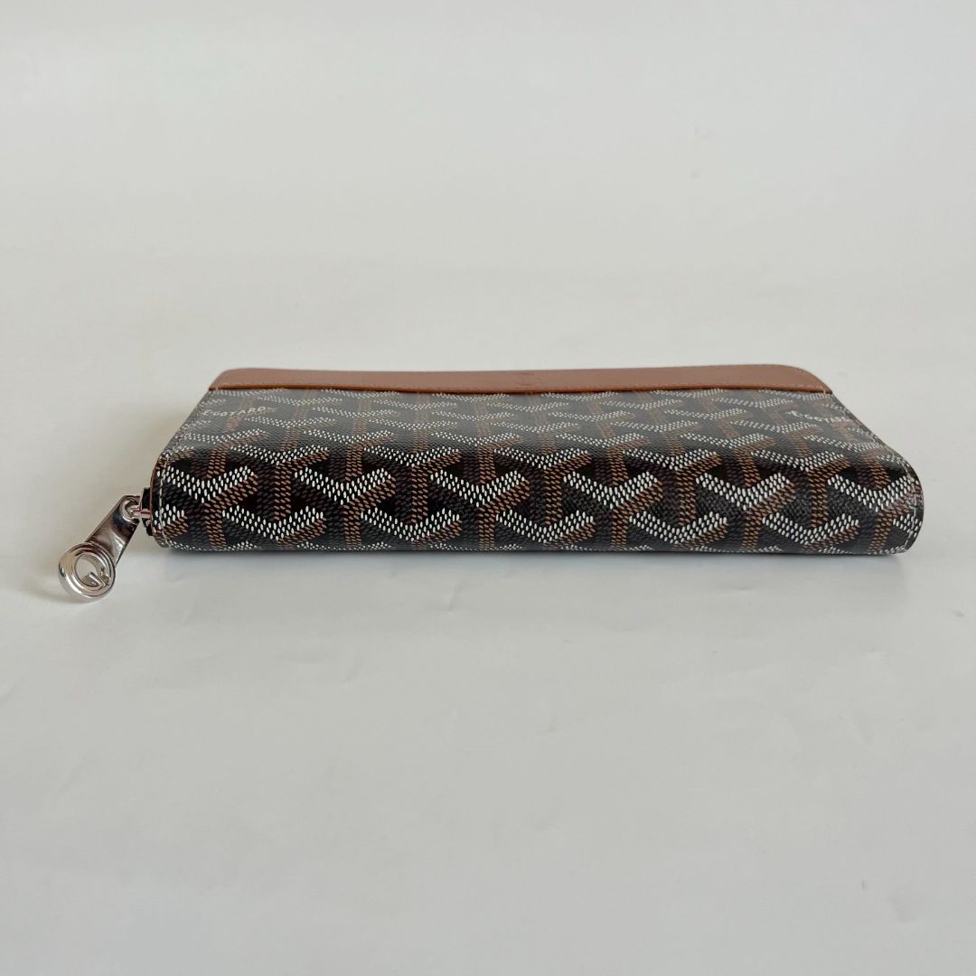 Goyard Matignon GM wallet in black and brown, featuring premium calf leather and the iconic Goyardine canvas. It has 12 card slots, center pocket with a zipper and two spacious compartments, wallet is also designed with button closure.