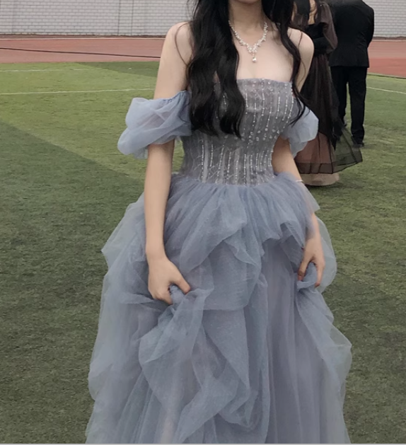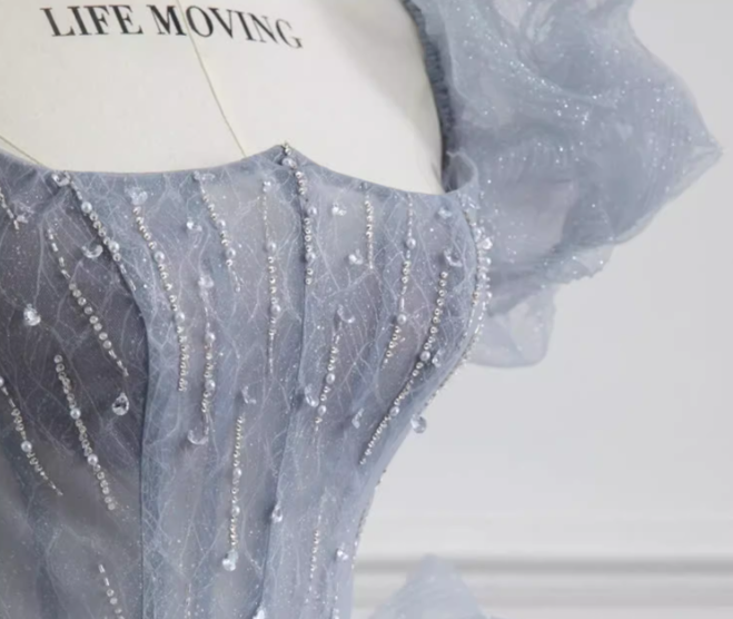 Gray blue beads long prom dress gray tulle formal dress ED0823