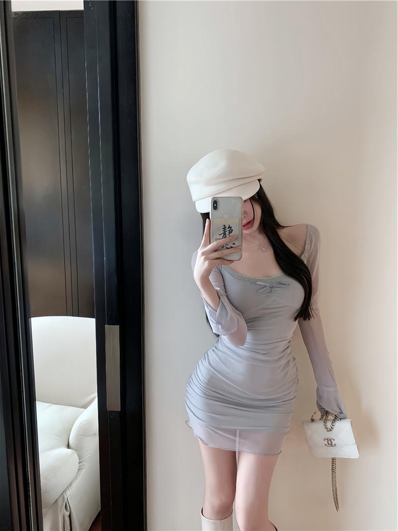 Gray blue sexy hot girl style mesh long sleeves U-neck off-shoulder hip skirt ED0422