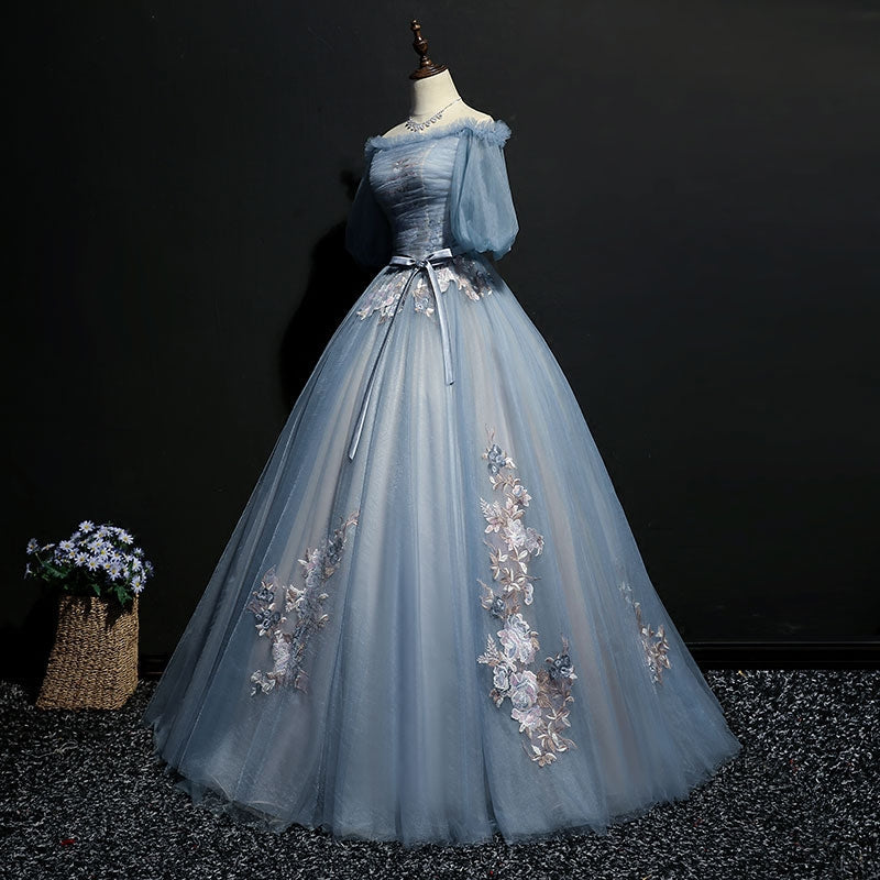 Gray blue tulle lace long prom gown, formal dress 7959