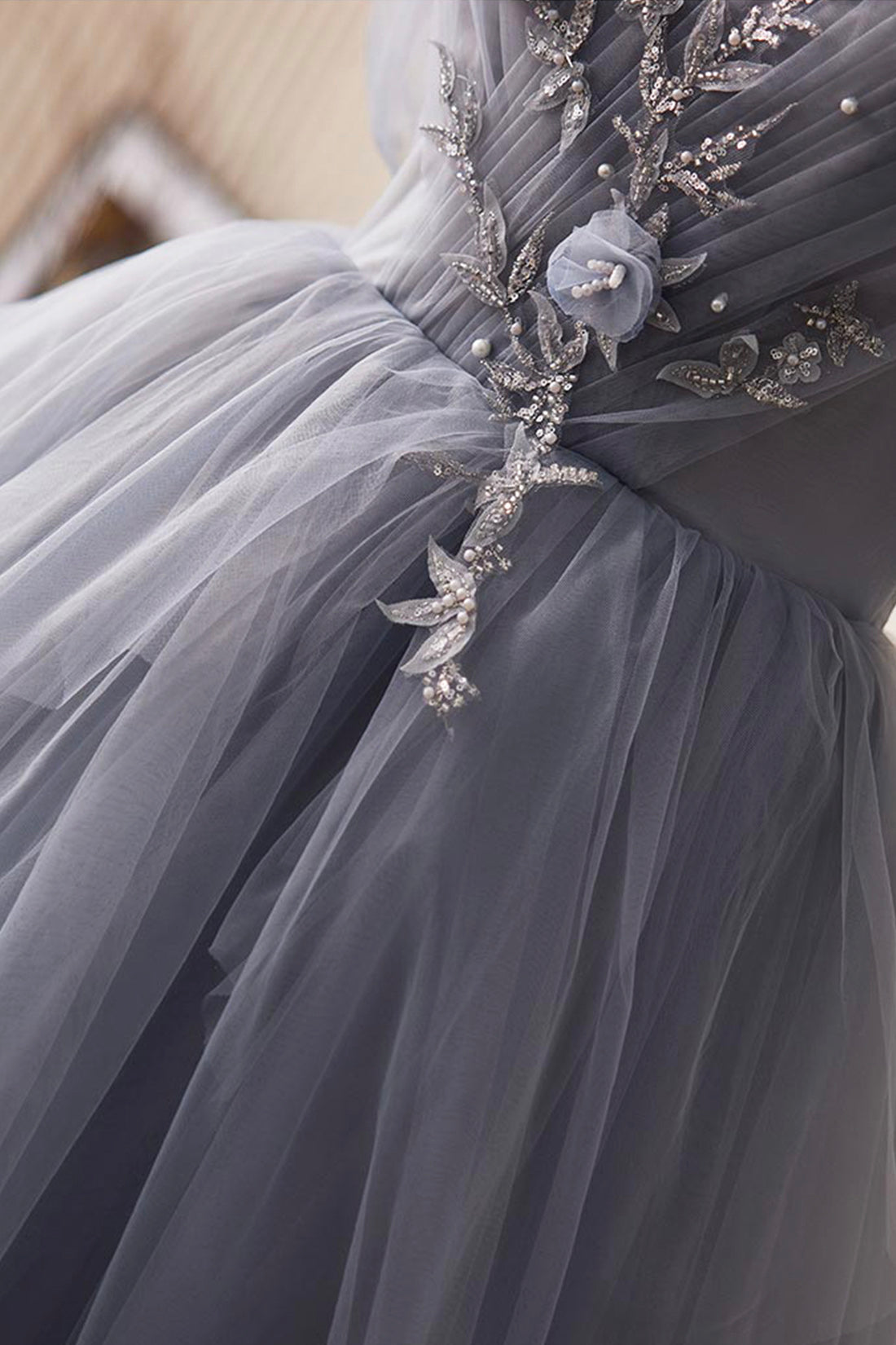 The Gray Tulle Long Prom Dress is an exquisite choice for formal affairs. Its off-shoulder design adds a touch of elegance, while the flowing tulle fabric creates a graceful silhouette. Perfect for parties and evenings, it embodies a blend of style and sophistication that's bound to turn heads.