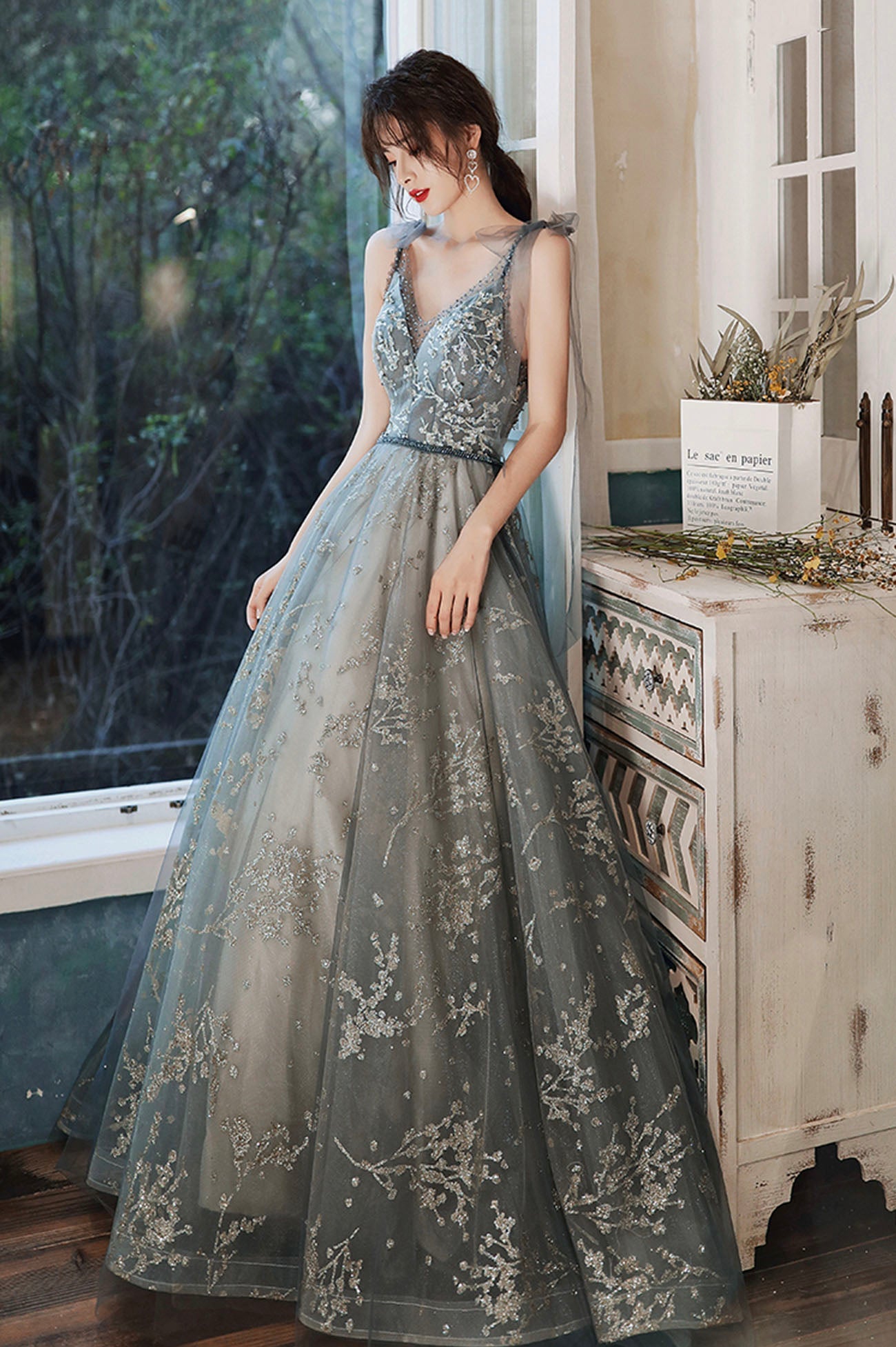 Gray V-Neck Tulle Long Prom Dress with Sequins, A-Line Graduation Dress