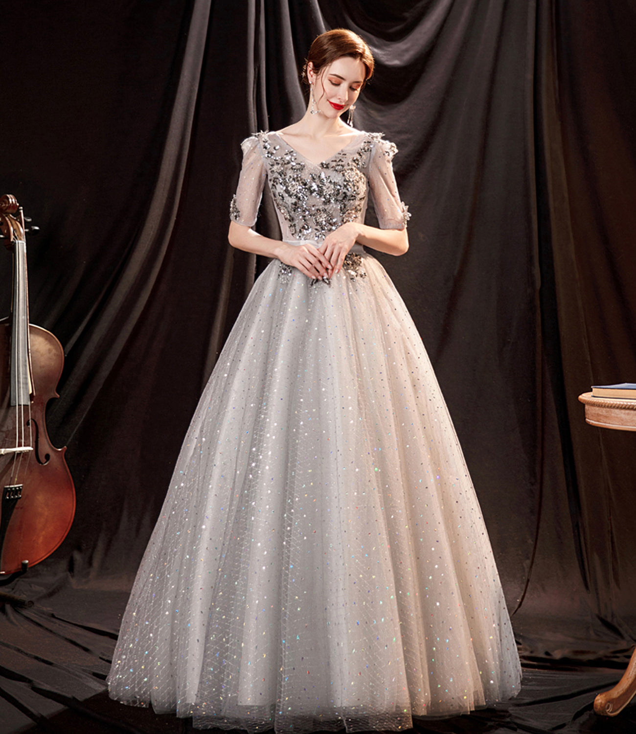 Gray tulle sequins long prom dress A line evening dress 8996