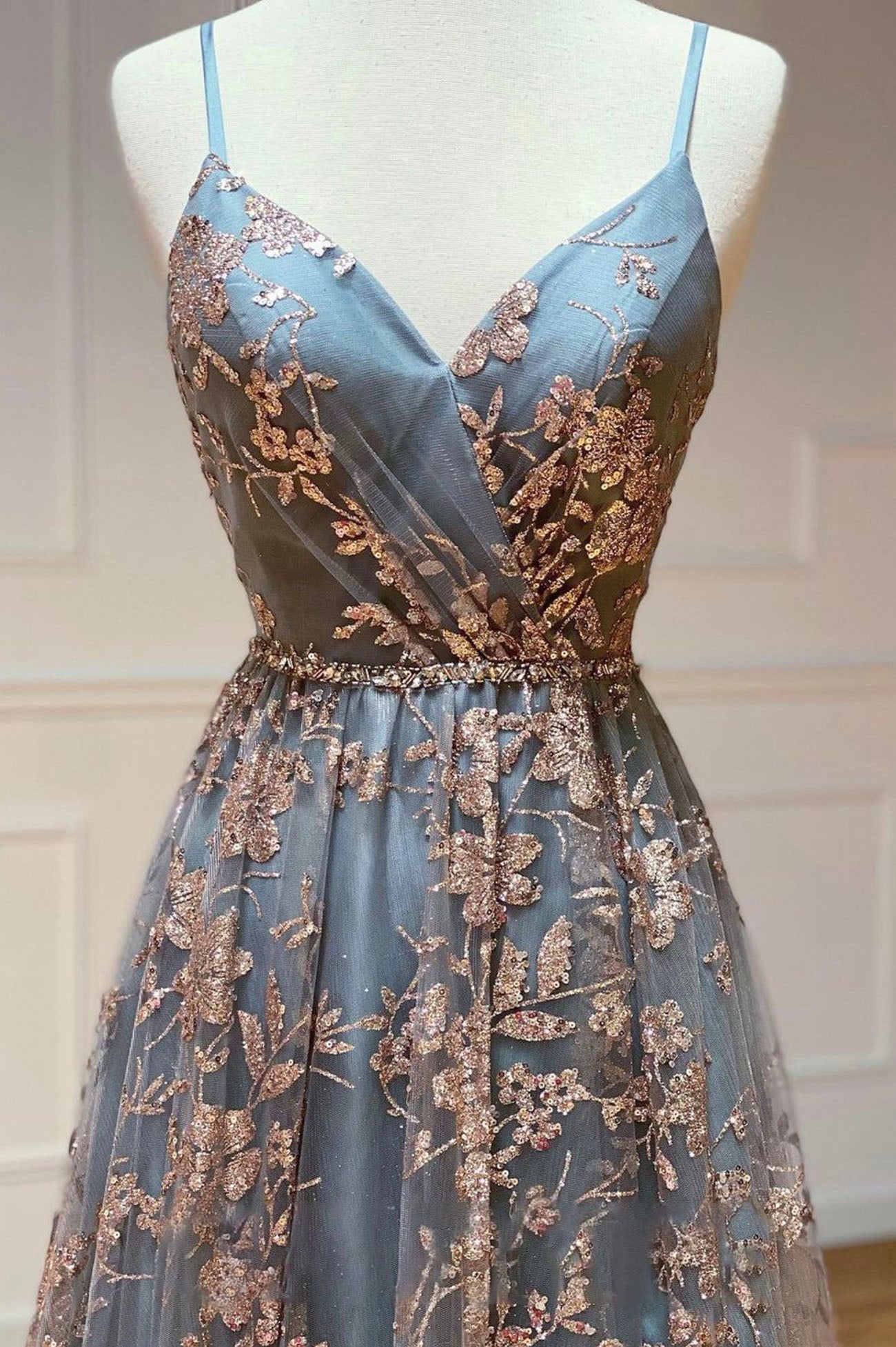 A-Line Tulle Sequins Long Prom Dress, V-Neck Backless Evening Dress