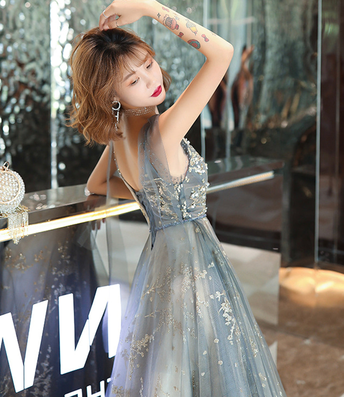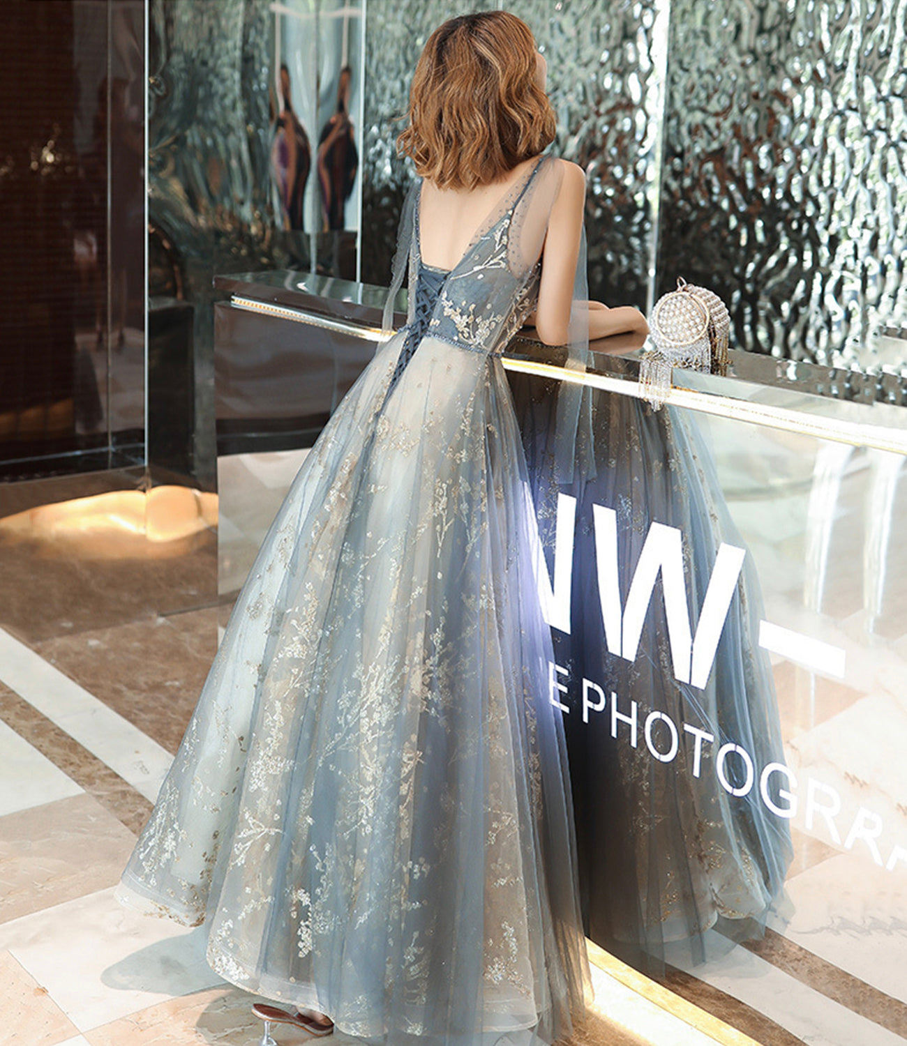 Gray tulle sequins long prom dress A line evening gown