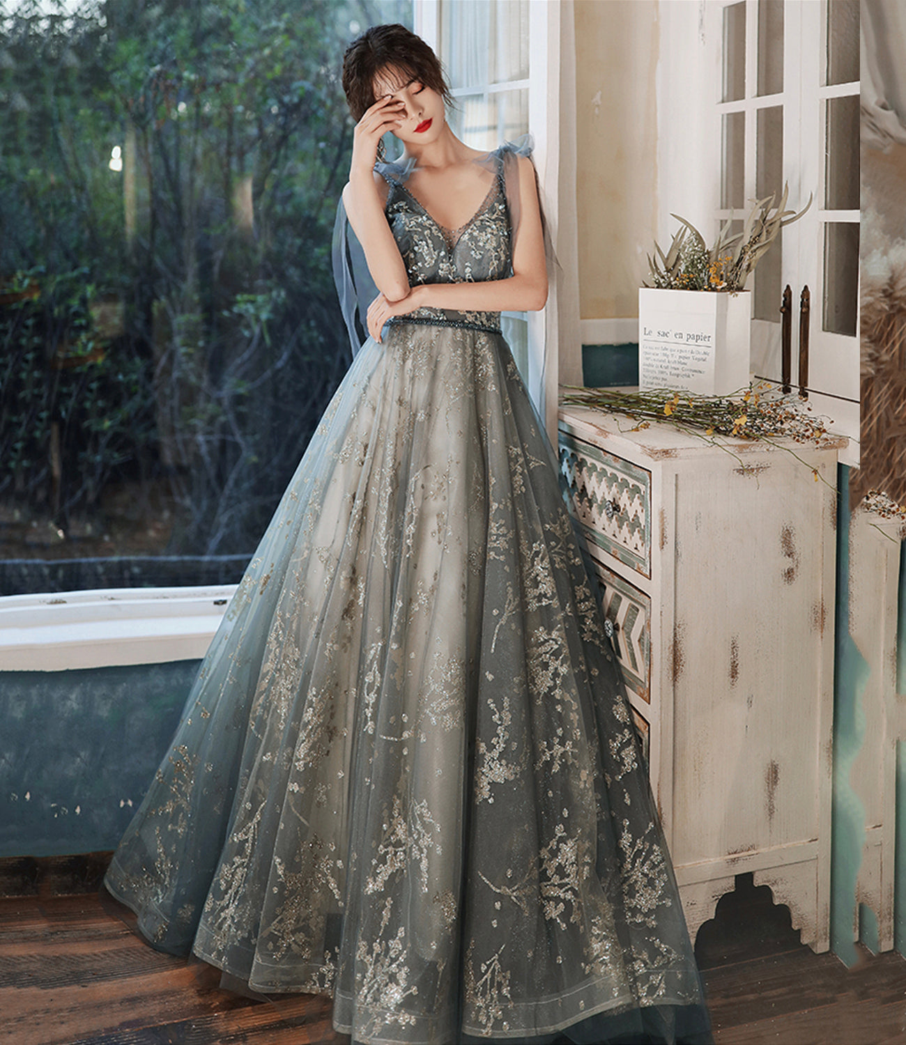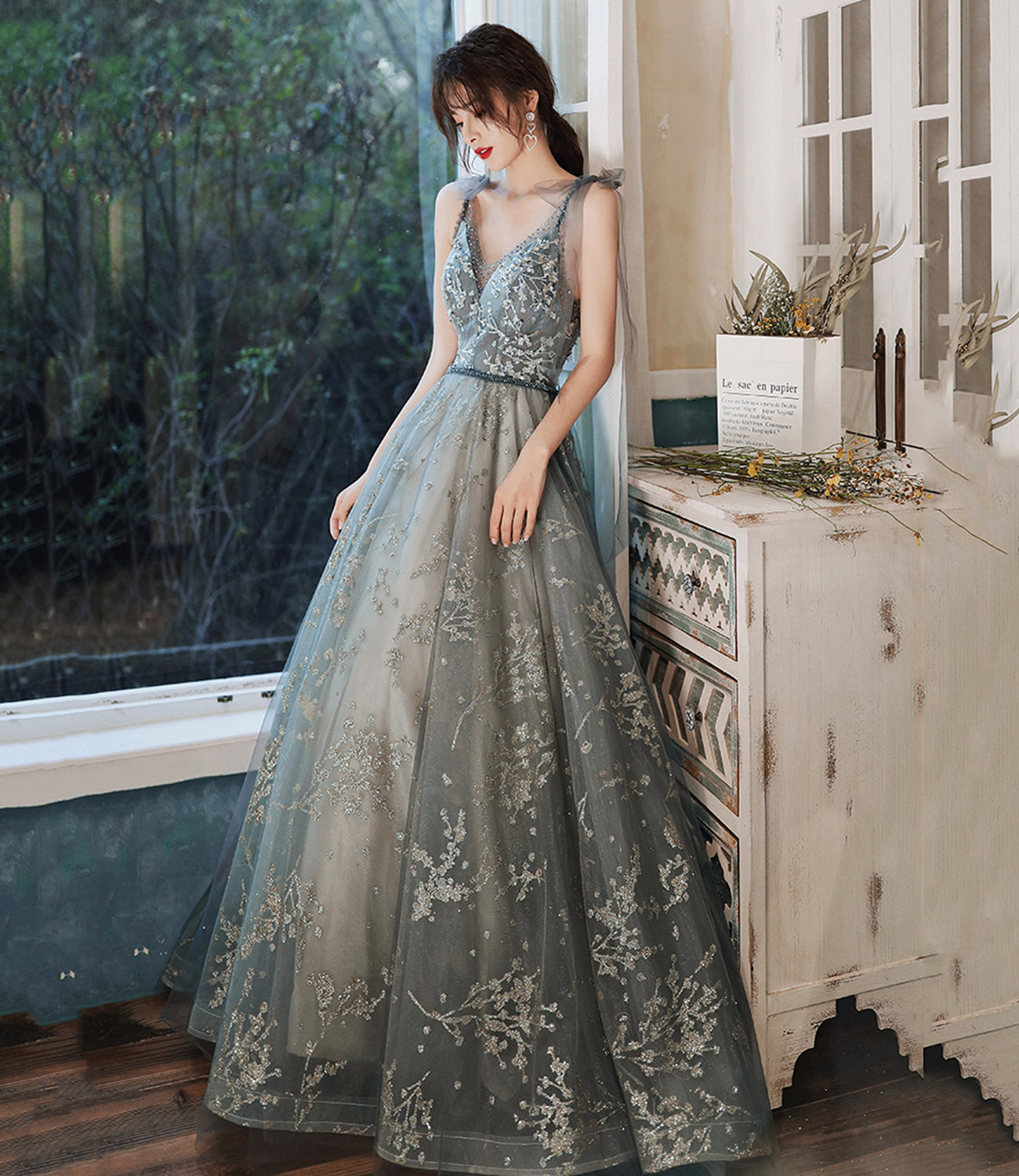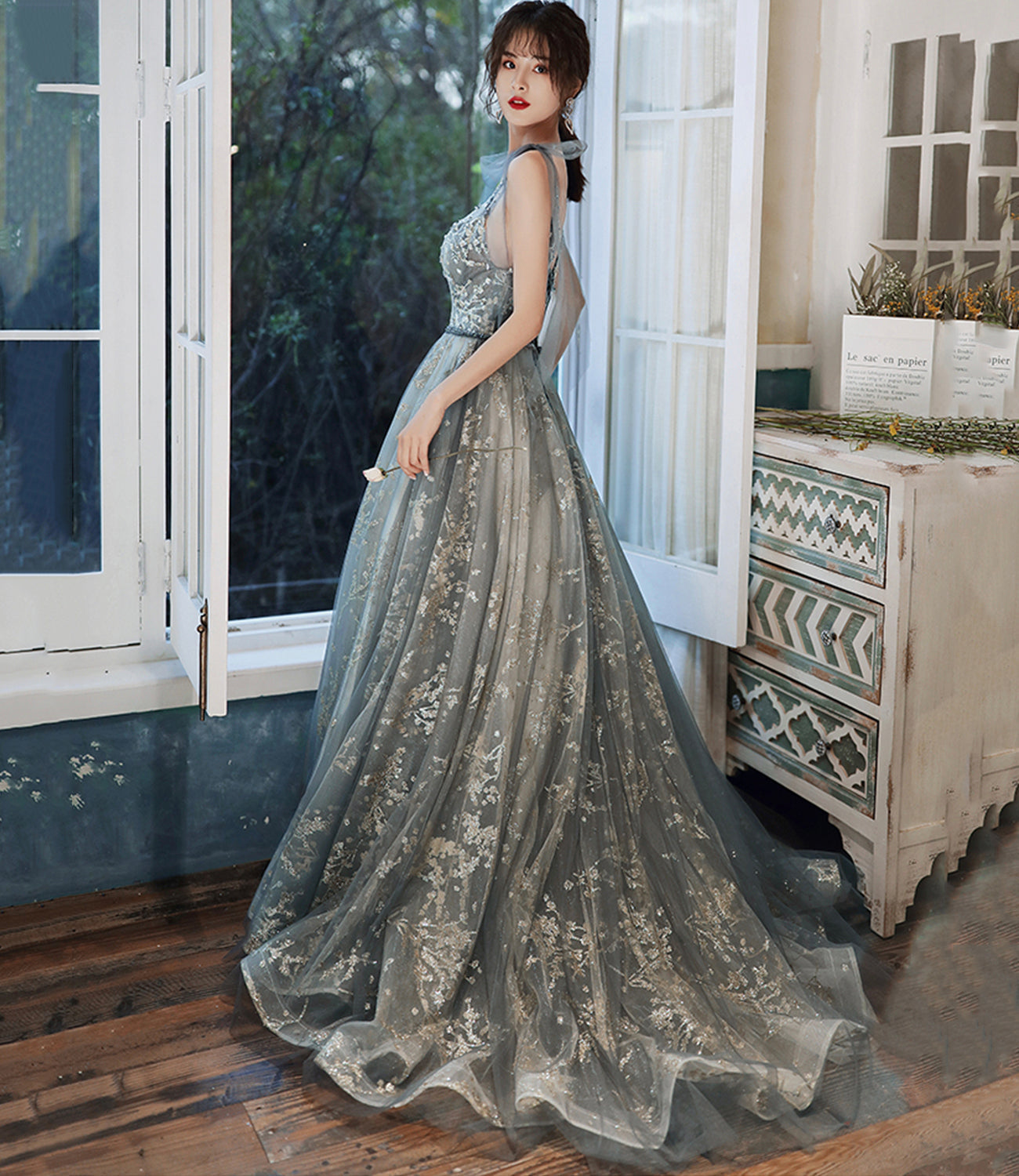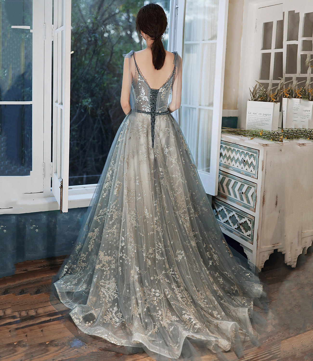 Gray tulle sequins long prom dress evening dress