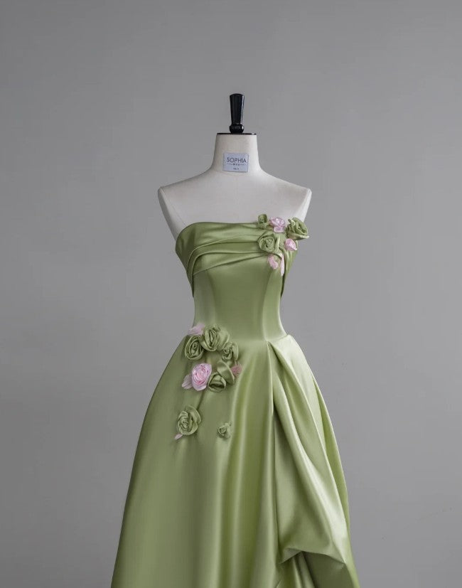 Beautiful Green A-Line Strapless Satin Applique Long Wedding Dress Cute Birthday Prom Dress ED01655