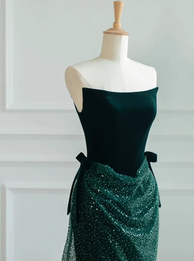Green A Line Strapless Velvet Sequin Long Sweep Prom Dress Graduation Prom Dress SH2492