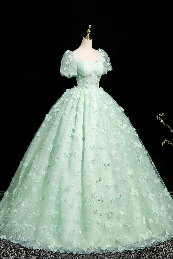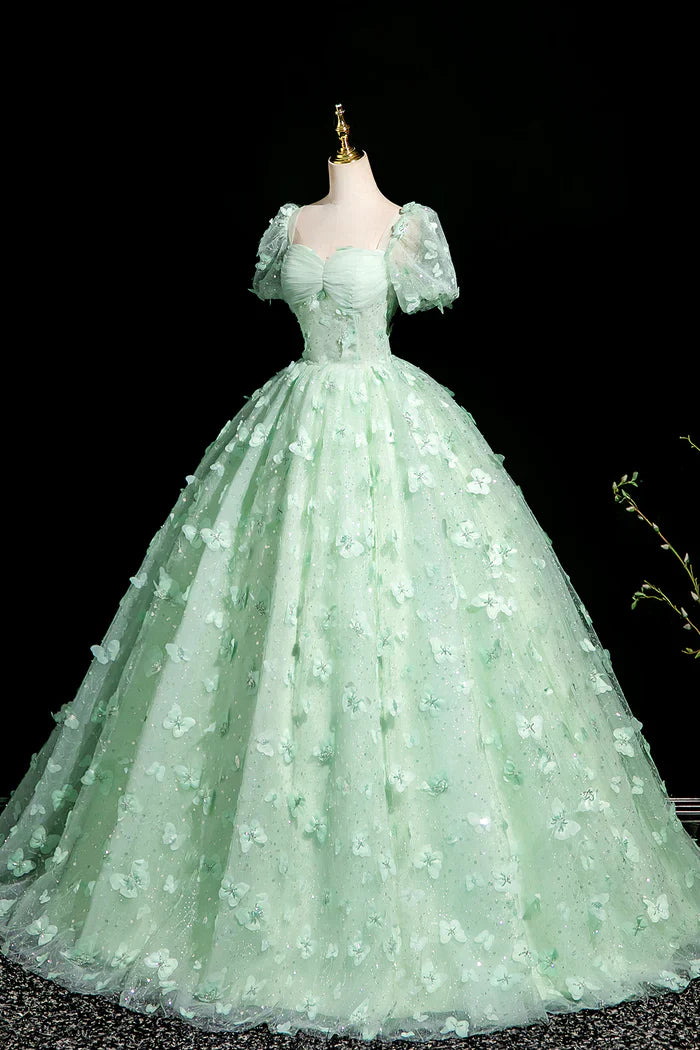 Green A-Line Tulle Beaded Sequin Long Prom Dress, Beautiful 3D Butterfly Evening Dress ED01605