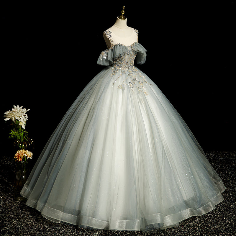 Green A-line tulle sequined long ball dress, green evening dress ED01104