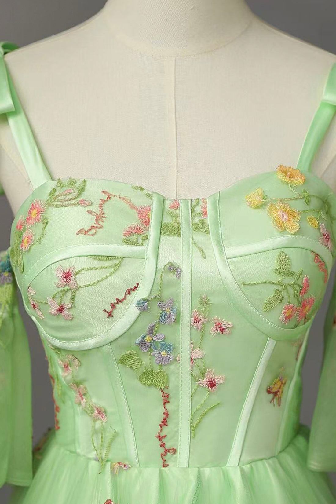 Select the Green Floral Tulle Long A-Line Formal Dress for a memorable appearance at your formal event. It's a blend of sophistication and style, ensuring you stand out in the crowd.