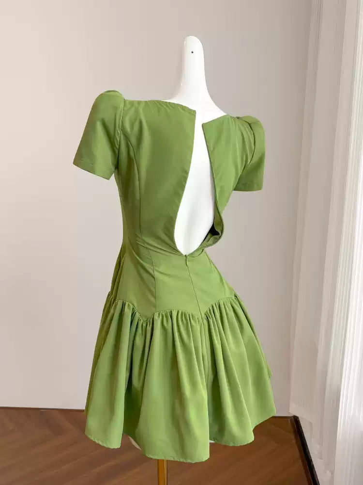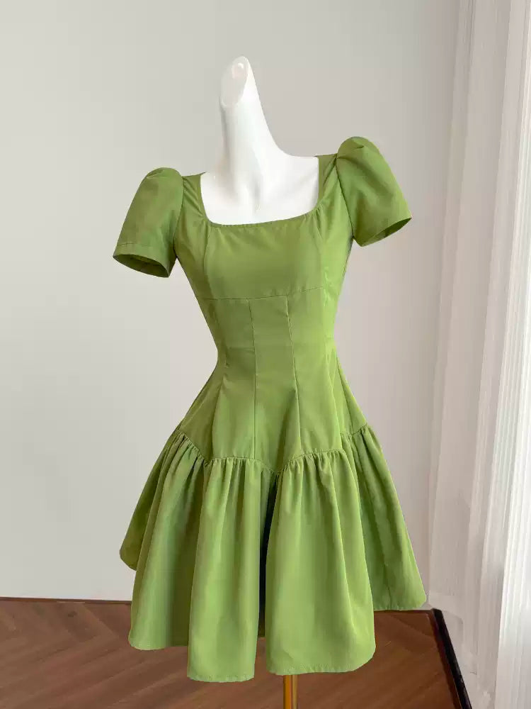 Green retro square neck homecoming dress for women summer short chic unique design small high-end dress 11289