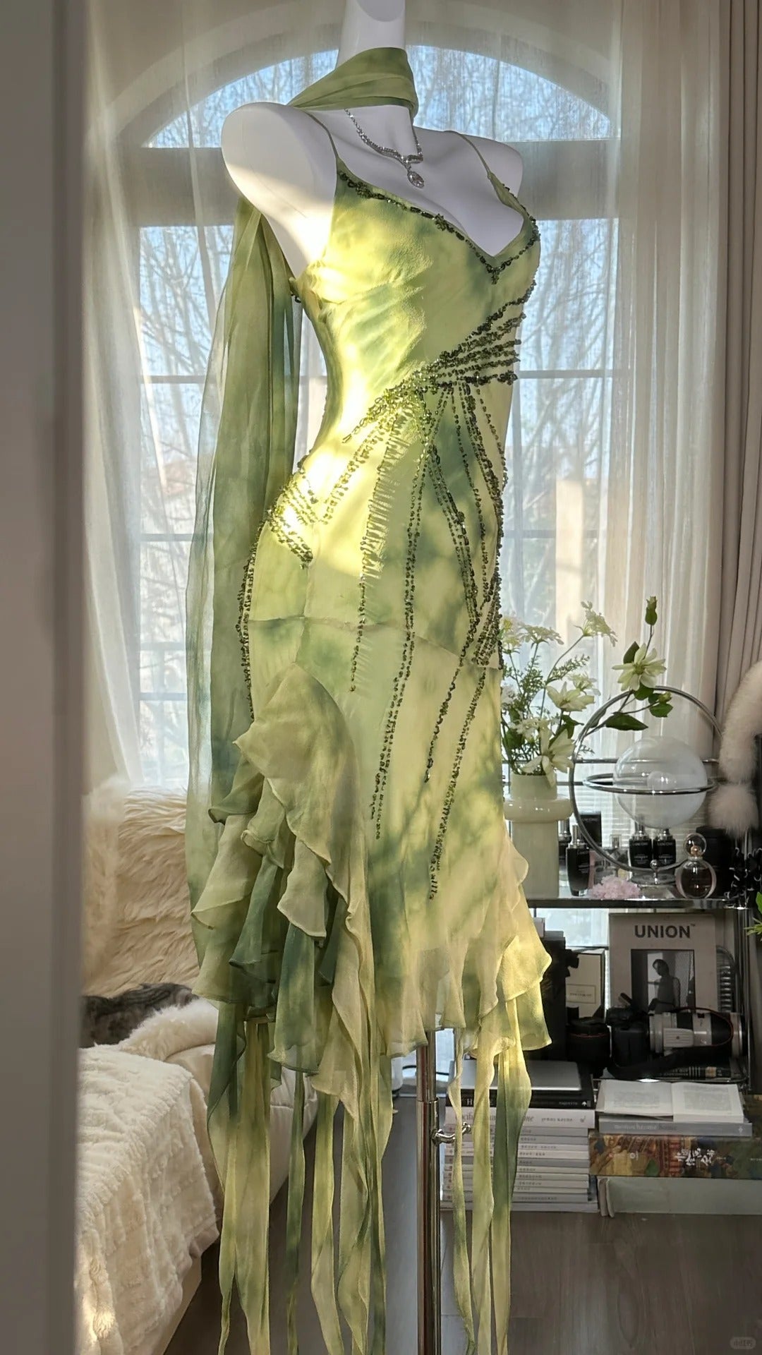 Green Romantic Elegant Exquisite Beaded Backless Long Chiffon Ruffle Homecoming Dress Prom Dress Evening Dress Birthday Vacation Party Dress gh4008