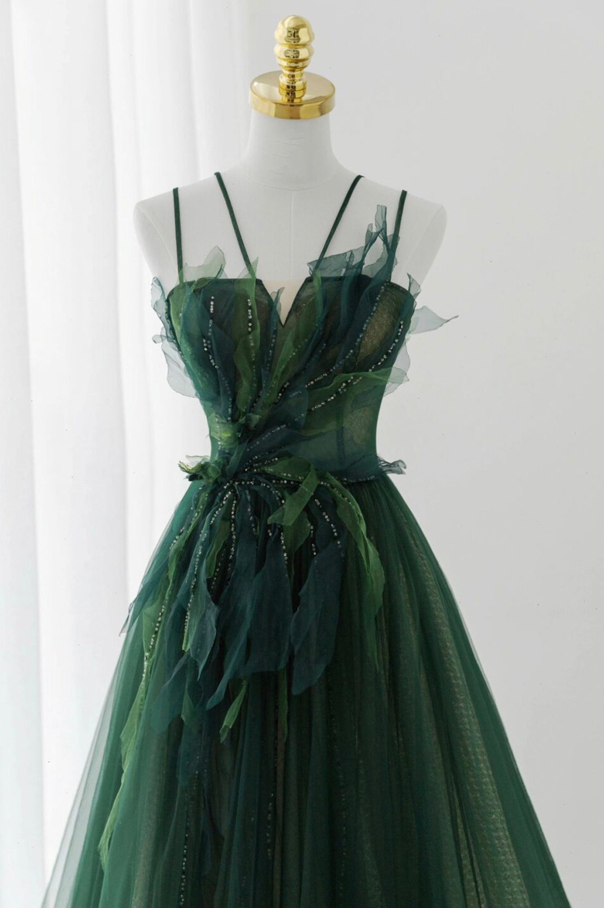 Green Tulle Long A-Line Prom Dress, Beautiful Spaghetti Straps Evening Dress