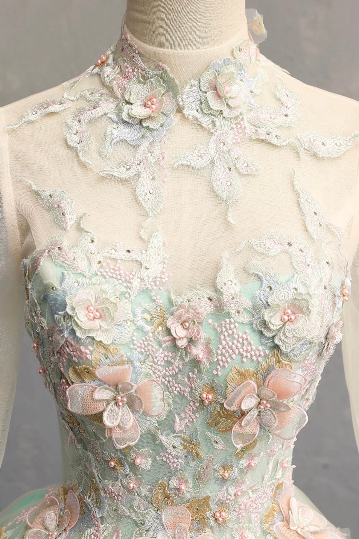 Green Tulle Lace Long Prom Dress, Beautiful A-Line Long Sleeve Party Dress