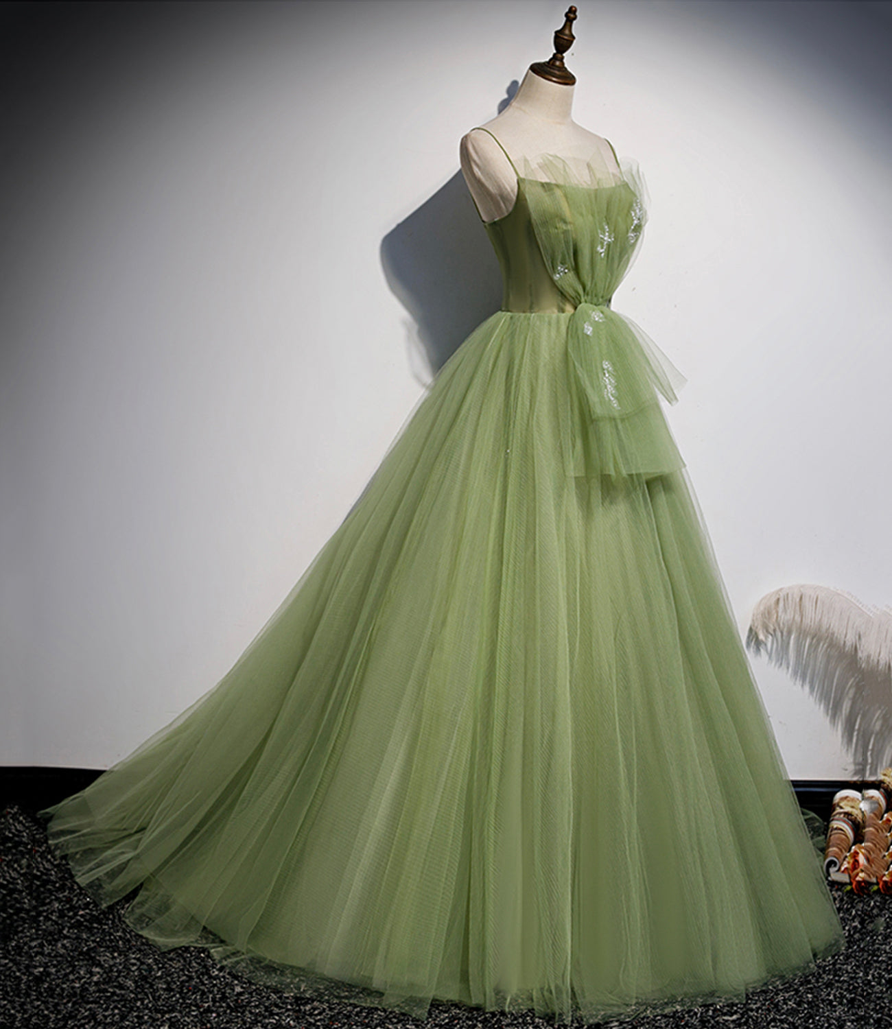 Green tulle long prom dress A line evening dress
