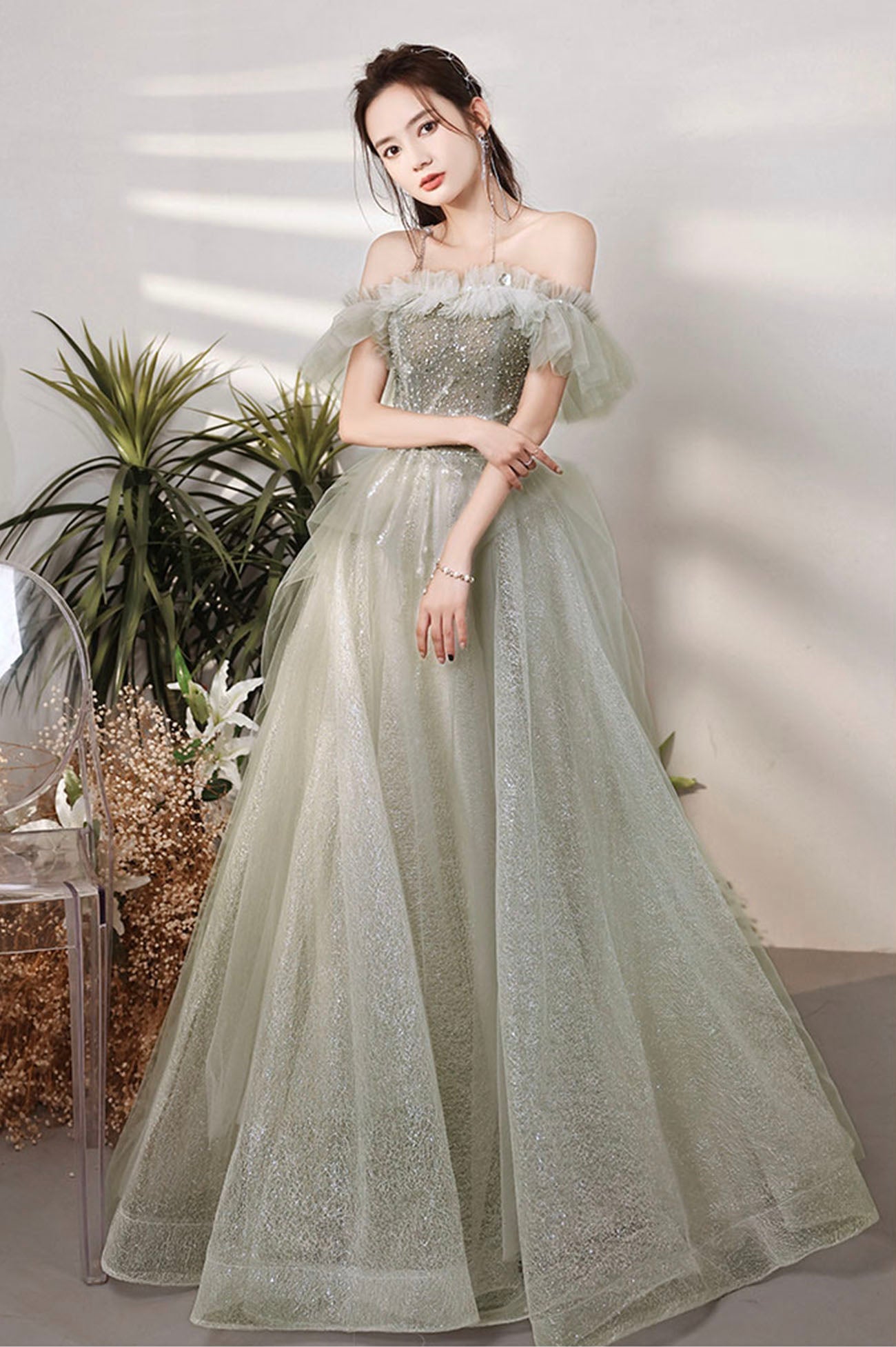 With the Green Shiny Tulle Long Prom Dress with Sequins, you'll shine bright on your graduation day, making it a memorable and glamorous moment.