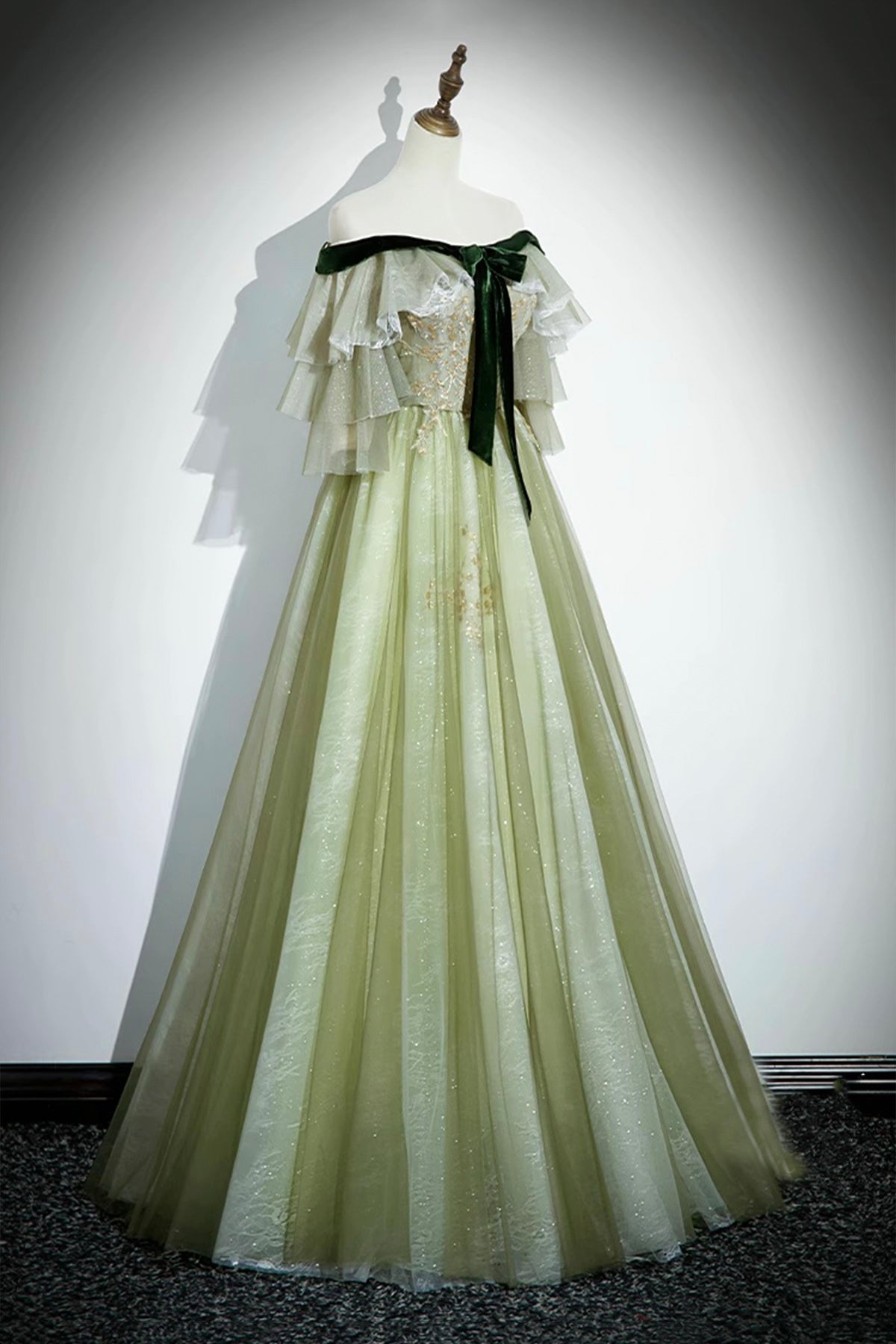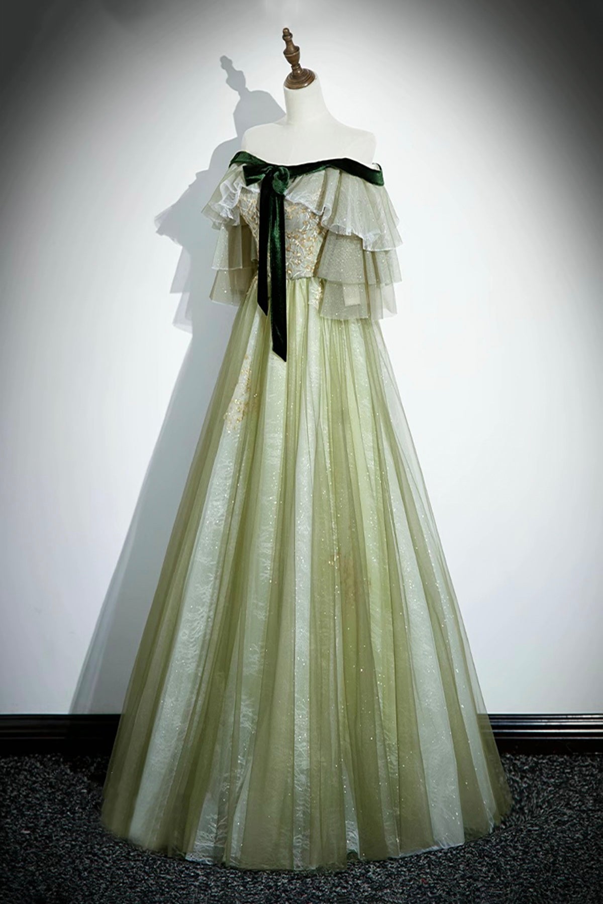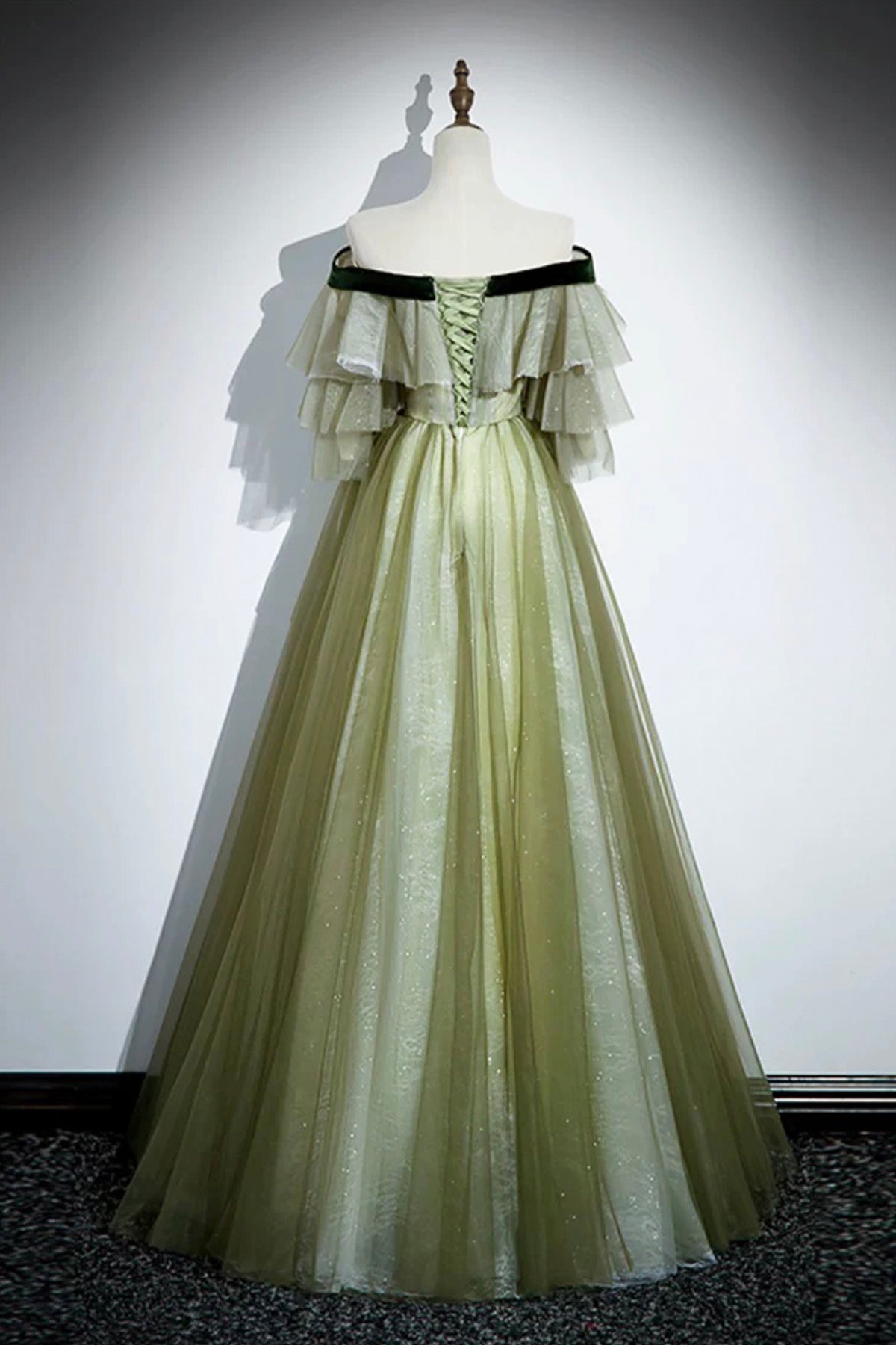 Green Tulle Sequins Long Prom Dress, Off the Shoulder A-Line Evening Dress