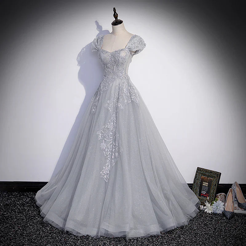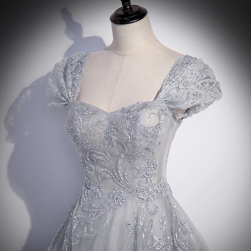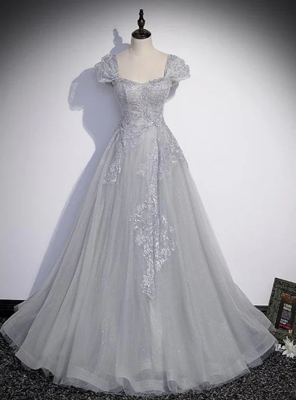 Grey Sweetheart Lace And Tulle A-Line Evening Dress, Light Grey Prom Dress gh54