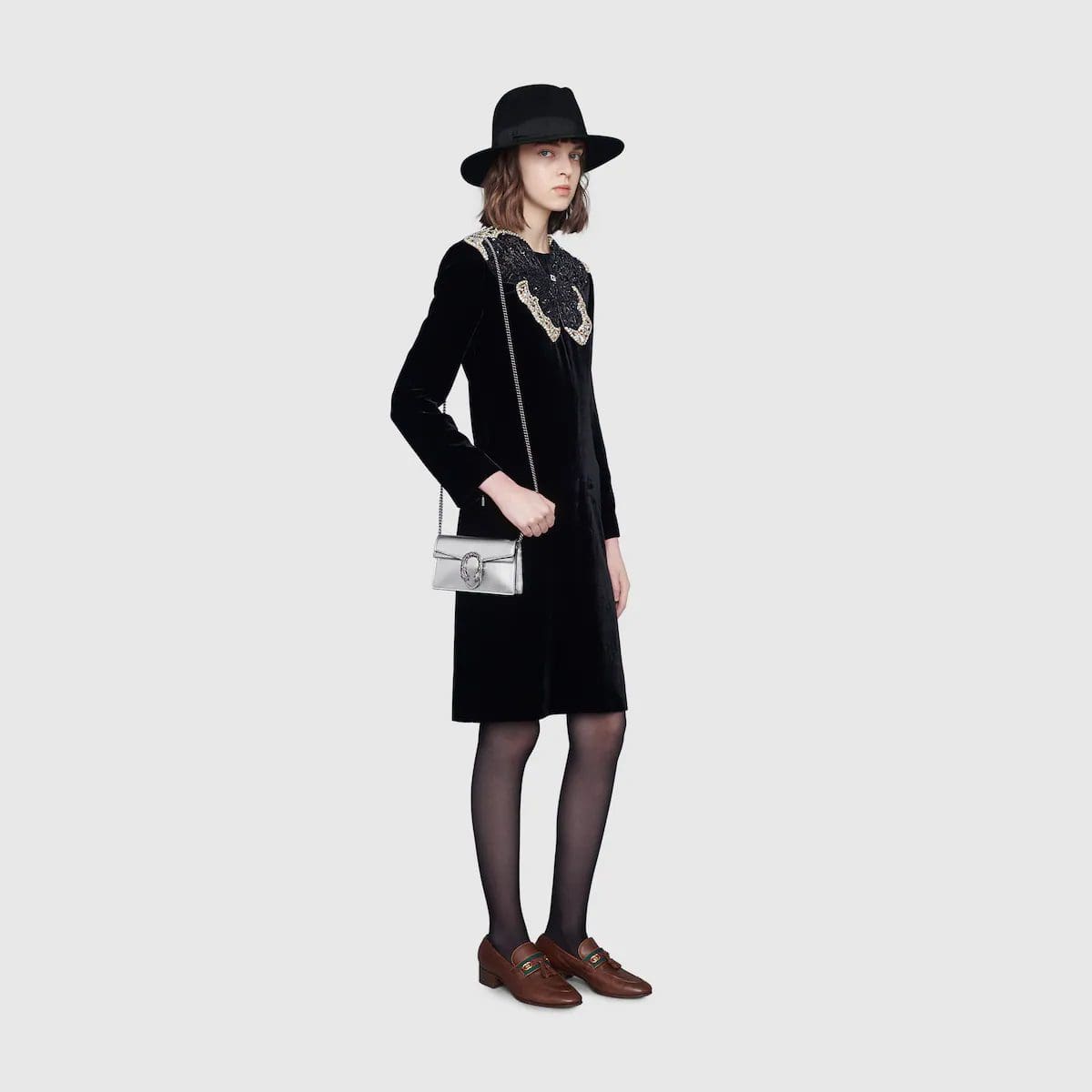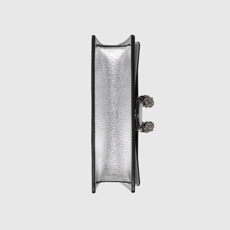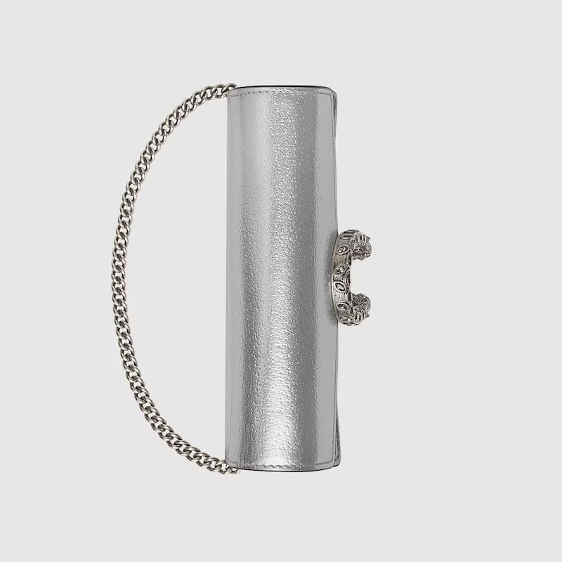 The structured super mini bag is introduced in metallic silver leather, with a key ring that can be used to attach the bag to a separate larger bag. The closure features the textured tiger head spur—the unique detail defines the line, referencing the Greek god Dionysus, who in myth is said to have crossed the river Tigris on a tiger sent to him by Zeus.