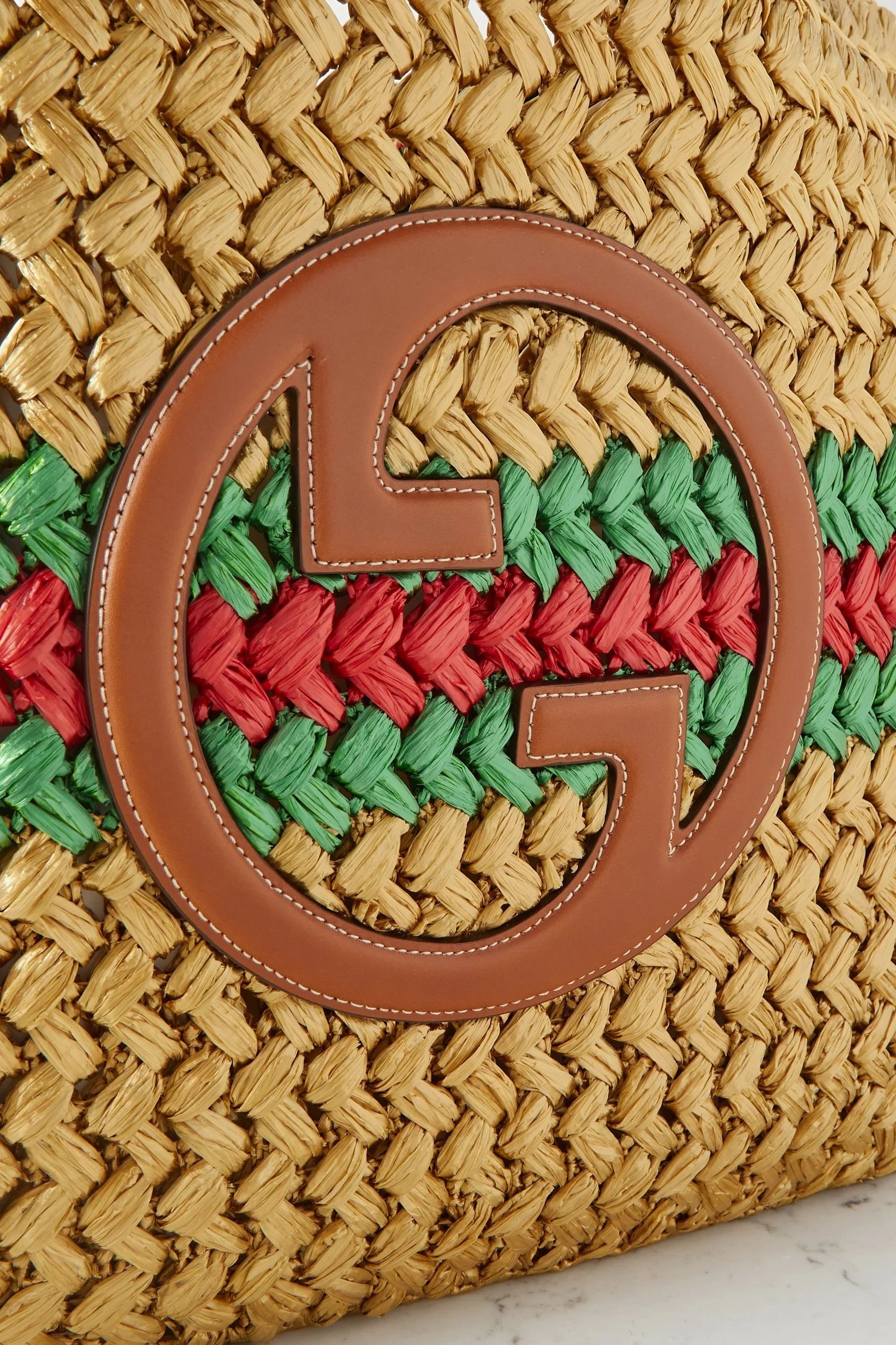 GUCCI Embellished leather-trimmed metallic crocheted raffia tote