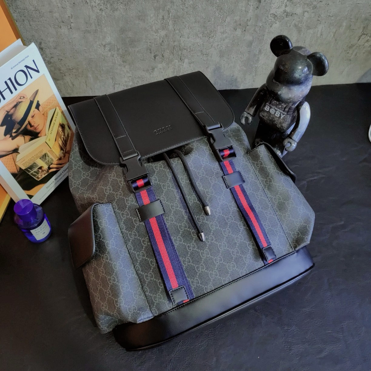 The GG motif in a distinct black/grey combination is further enriched with Web straps and black leather trims. Made in soft GG Supreme, a softer version of GG Supreme canvas, crafted from a coated microfibre fabric with the GG motif.