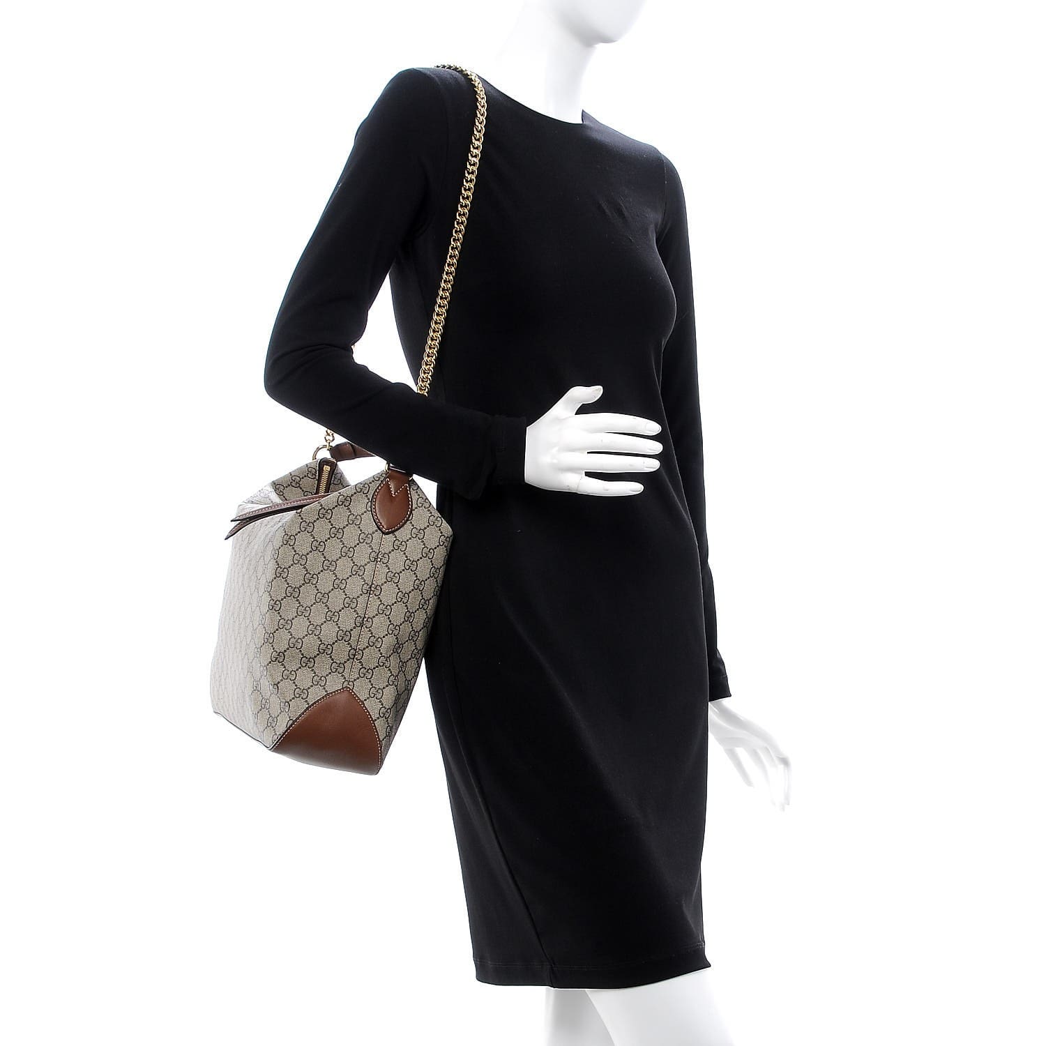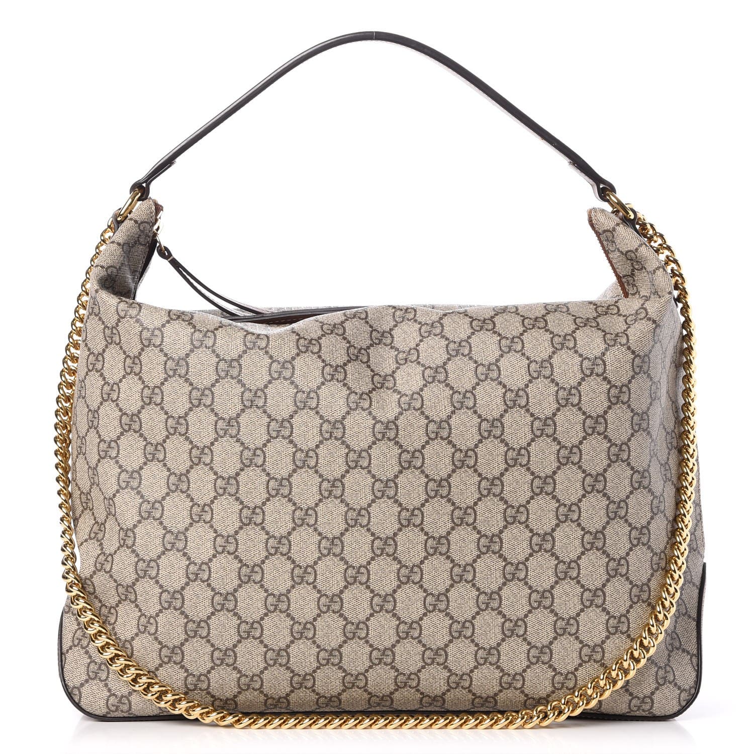 This is an replica GUCCI GG Supreme Monogram Large Linea A Hobo in Light Brown. This stylish tote is crafted of Gucci GG monogram coated canvas in beige. The bag features a brown looping leather shoulder strap, a gold chain shoulder strap, reinforced base corners and leather trim. The top opens to an brown fabric interior with zipper and patch pockets. This is a perfect everyday hobo with the sophisticated style of Gucci!