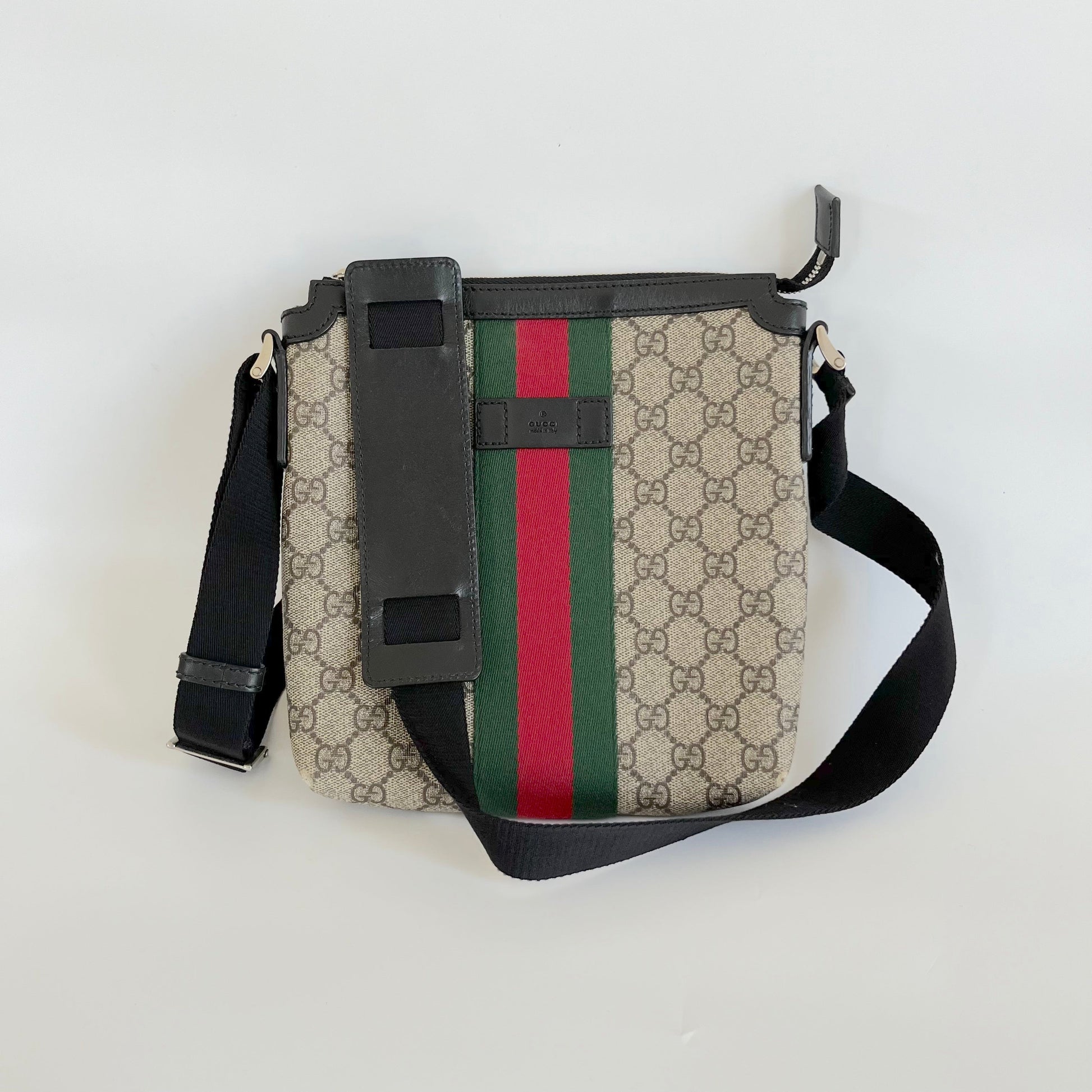 Gucci GG Supreme Monogram Web Messenger Bag with black leather trim, with signature web detail across the front
