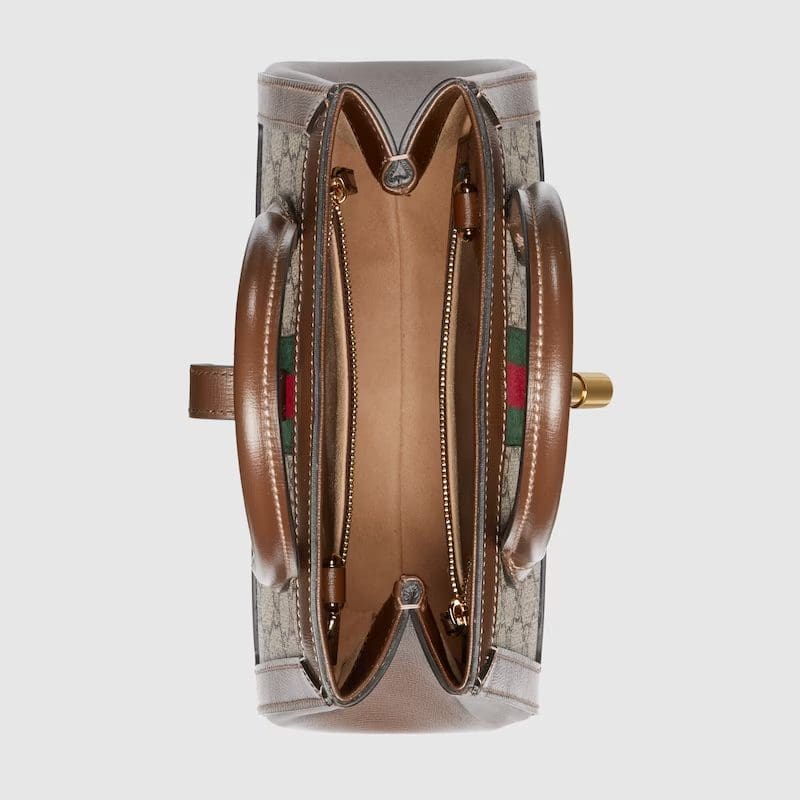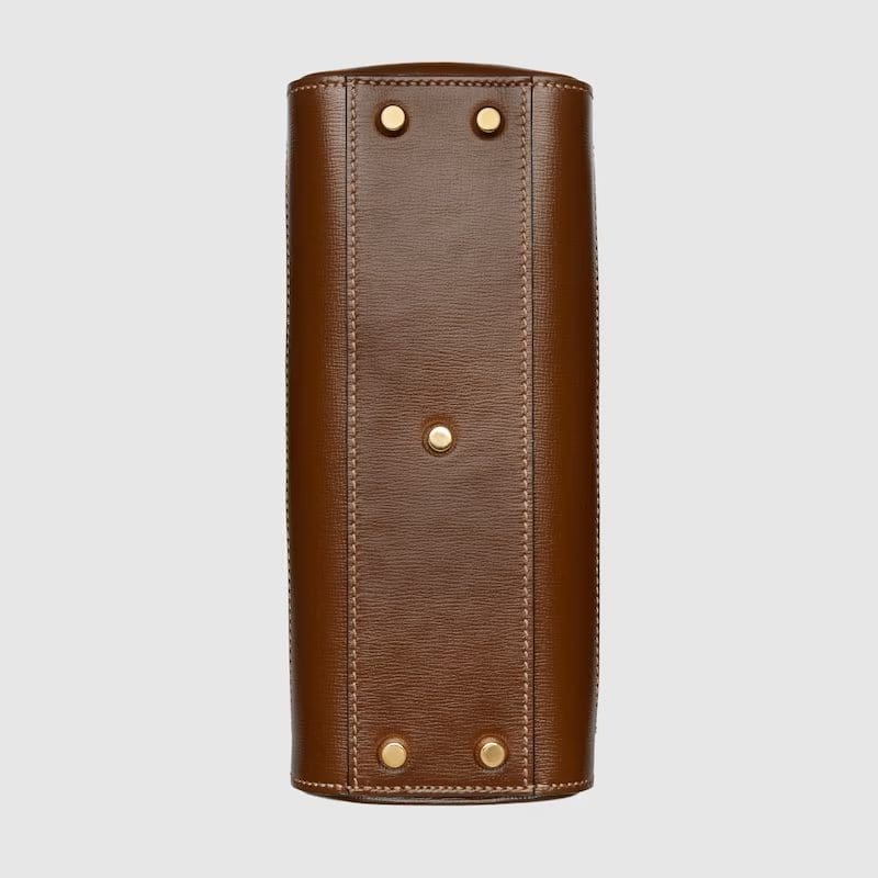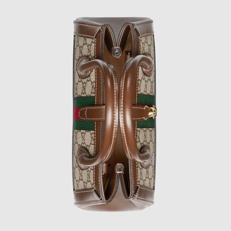 The Jackie 1961 line is further elevated through new sizes and styles, including a rectangular-shaped version with a top handle and detachable shoulder strap. The gold-toned piston hardware appears against the archival green and red Web stripe.