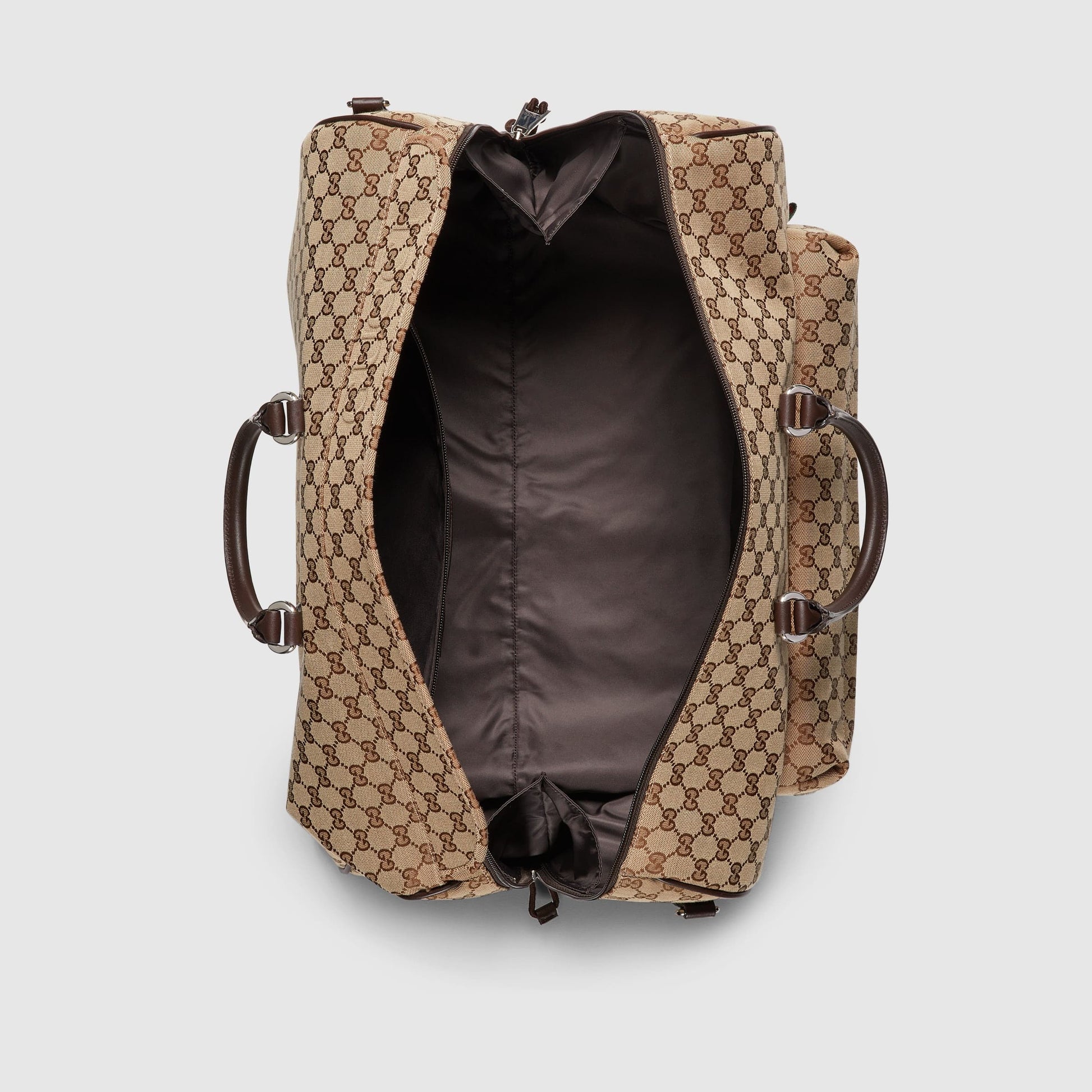 Signature travel pieces appear in the men’s Fall Winter collection with a sporty attitude. Crafted from the Original GG canvas, timeless accessories and color palettes convey a contemporary mood through subtle details, such as the Web and embossed Gucci logo. This large duffle bag, in beige and ebony canvas, features multiple pockets, top handle and D-ring.