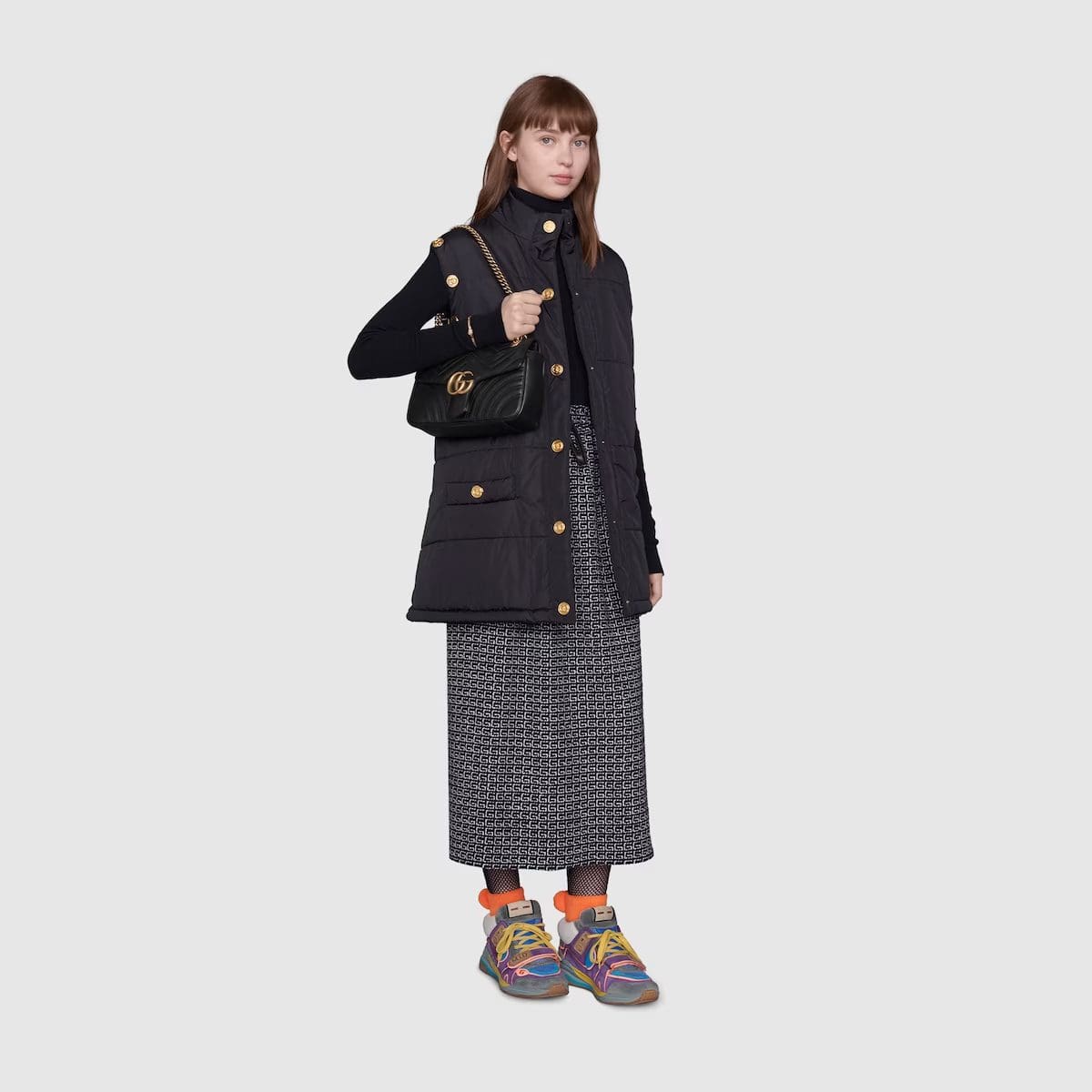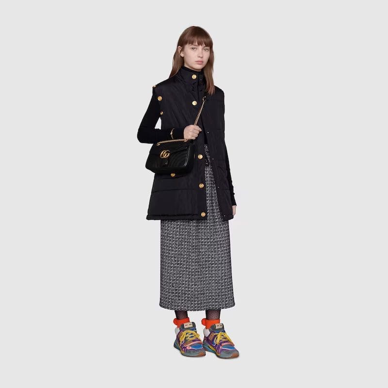 The small GG Marmont camera bag has a softly structured shape and a flap closure with Double G hardware. The sliding chain strap can be worn multiple ways, changing between a shoulder and a top handle bag. Made in matelassé chevron leather with a heart on the back.