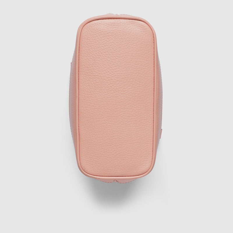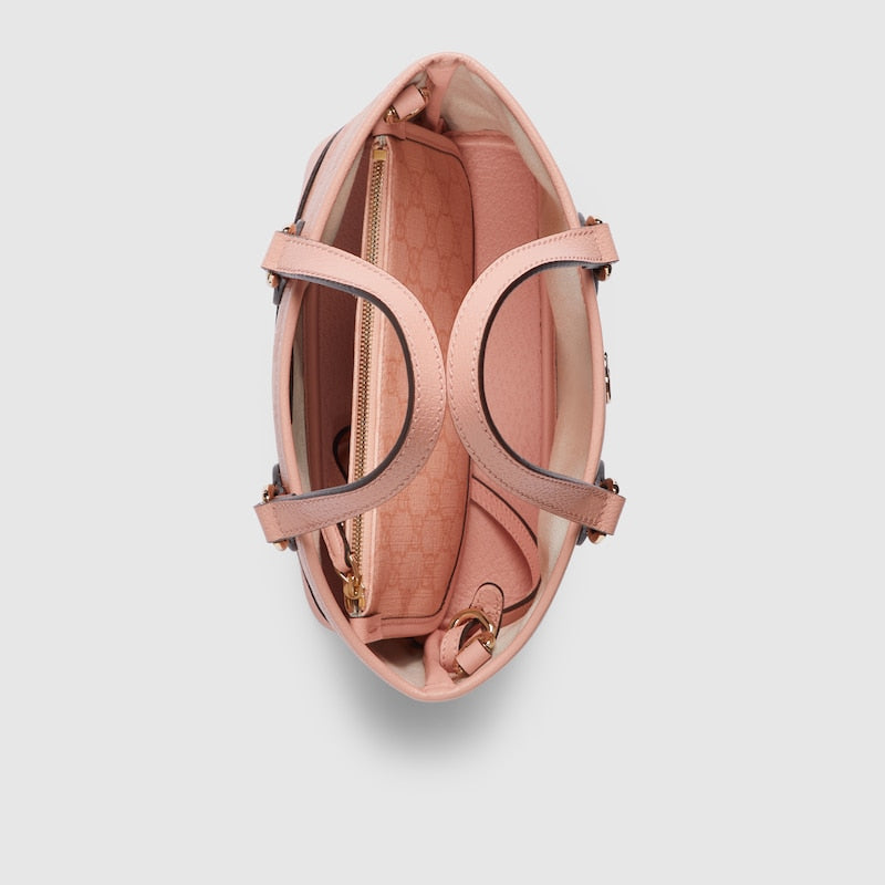 The Ophidia line is further elevated through new sizes and styles, like this mini tote bag which has a detachable pouch and detachable leather shoulder strap, allowing for versatile wear. The dusty pink GG Supreme canvas is complete with light gold-toned Double G hardware.
